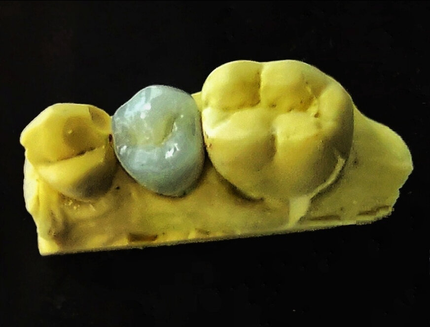 Металлокерамические коронки – это один из вариантов протезирования, когда стоматологические коронки изготавливаются на основе металлического каркаса, облицованного снаружи керамической массой (рис.1). Облицовка каркаса заключается в послойном нанесении слоев керамики, причем после нанесения каждого слоя происходит обжиг коронки в специальной печи при температуре 800-950 градусов (т.к. это обеспечивает прочную химическую связь металла и керамики). Металлокерамика является наиболее удачным компромиссом между прочностью, эстетикой и стоимостью при протезировании зубов. По этим характеристикам металлокерамика занимает в стоматологии промежуточное положение – между красивыми дорогими коронками из безметалловой керамики и обычными литыми металлическими коронками. При этом стоит отметить, что существует несколько видов металлокерамических коронок, но самой хорошей эстетикой (но при этом и высокой ценой) – обладает так называемая «металлокерамика с плечевой массой». На данном фото показана 1 к