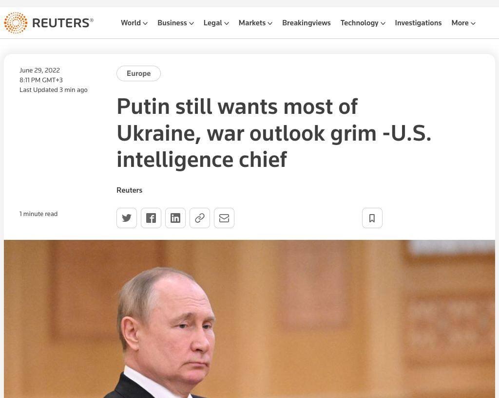 1. ВС РФ не достигают всех целей Путина, но добиваются новых побед на отдельных участках и занимают новые территории Украины 2. ВС РФ добиваются прорывных, существенных побед над ВСУ (читай - полный разгром) 3. ВСУ удается одержать локальные победы и отвоевать некоторые территории, занятые ВС РФ после 24 февраля на южном направлении "Картина остается достаточно мрачной", - цитирует ее слова Рейтер