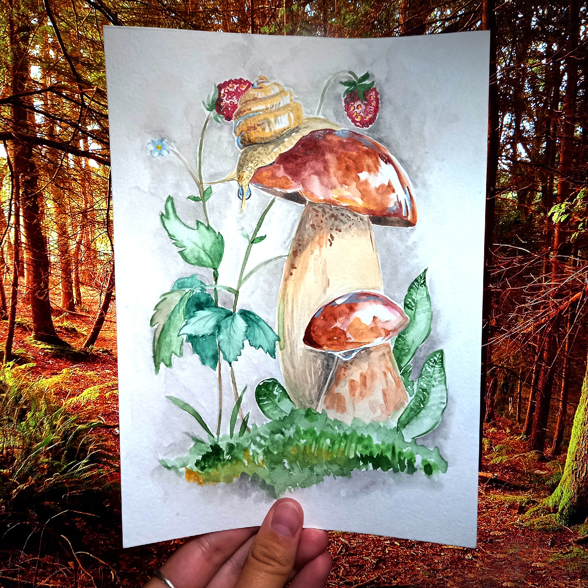🎨Хочу обратить ваше внимание на две капли разной стилистики в выполнении. Как по разному они рисуются в зависимости от фона, который находится сзади них. 🎨Я поставила себе задачу передать визуально блеск и влажное состояние шляпок грибов. 🎨На данном изображении изображены Белые грибы после дождя.