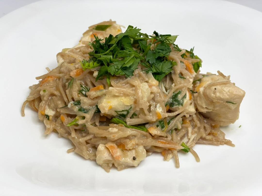 Быстрый и сытный вариант обеда или ужина! Ингредиенты: Куриное филе, Лук, Морковь, Растительное масло , Вермишель, Сыр, Творожный сыр, Вода, Соль, перец, зира, Зелень Способ приготовления: Лук и морковь очищаем. Лук нарезаем четверть кольцами, морковь натираем на крупной тёрке. Разогреваем масло в сотейнике, обжариваем лук и добавляем морковь. Куриное филе нарезаем крупными кусочками. Добавляем к овощам, перемешиваем, наливаем стакан воды, тушим 20 минут. Добавляем вермишель, перемешиваем. Натираем сыр на мелкой тёрке. Смешиваем творожный сыр, стакан воды и твёрдый сыр. Заливаем соусом курицу с вермишелью, перемешиваем. Солим, перчим, насыпаем зиру. Моем, режем зелень. Добавляем в сотейник, перемешиваем, выключаем. Приятного аппетита ❤️