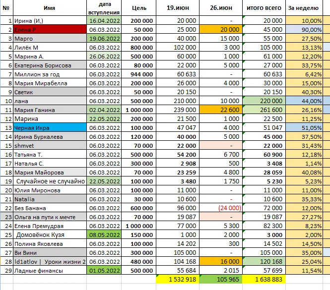 Доброе утро,мои дорогие читатели, любимые подписчики этого канала. Вот и понедельник. У кого то продолжается отпуск(как у меня), а у кого то новая трудовая неделя. Но у меня есть ещё обязанность(по желанию) рассказывать всем о результатах нашего марафона. 😀 Нас 29 человек, которых объединила одна цель, накопить на мечту, на отпуск, на решение своих проблем. Марафон не на один день. И у каждого свои цели и свой темп, но мы обязательно придём к финишу. Да, не все выдерживают даже такой темп, есть участники, которые уже и сошли с дистанции. Но, есть и такие, которые бегут впереди всех и тянут нас вперёд своим примером. Вот результаты прошлой недели. Кто же показал самый лучший результат на этой неделе? На первом месте участница И. (Ирина), Марго, Марина А.,которые позже присоединились к нашему марафону, но уже показывают прекрасные результаты. Поздравляем!!! А вот и лидеры марафона, которые вышли вперёд (в процентах) Поздравляем, вас, дорогие девочки! Но особенно приятно, что Ири