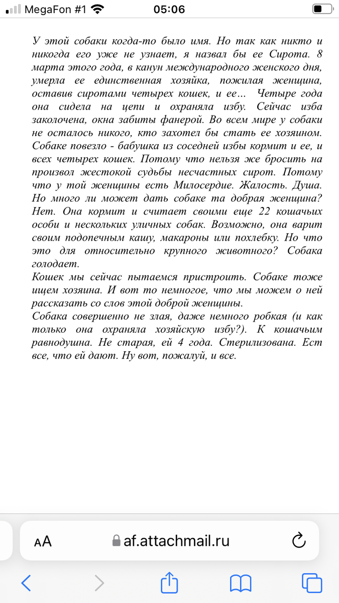 Многие из Вас уже знают, что мы подружились с Ириной - автором канала Милькины кошки. У Иры есть подписчик Сергей - человек с очень добрым сердцем, с которым мы тоже стали друзьями 🤗 Сергей забрал у меня кошечку 11 лет, которая осталась без хозяев, несколько раз помог мне финансово в патовых ситуациях🙏🏻 На днях Сергей рассказал историю, которая не выходит у меня из головы👇🏻 Я помню как меня резанула история с Рыжим (ныне Вегасом), который потерял хозяина и остался один во всём мире. Тут похожая ситуация. Без хозяина и без имени… Собака сейчас находится в Туле. Друзья! Сергей много лет занимается спасением кошек. С пристроем собак не очень знаком. Давайте поможем все вместе. Может быть кто-то из Вас сможет прозвонить приюты в Туле? Может быть у Вас в городе какой-то приют будет готов принять собаку при условии финподдержки? Я в середине июля забираю в Москве Султана. Теоретически могу посадить в машину и эту девочку, Сергей в Москву её сможет привезти. Вопрос - куда её дальше? Н