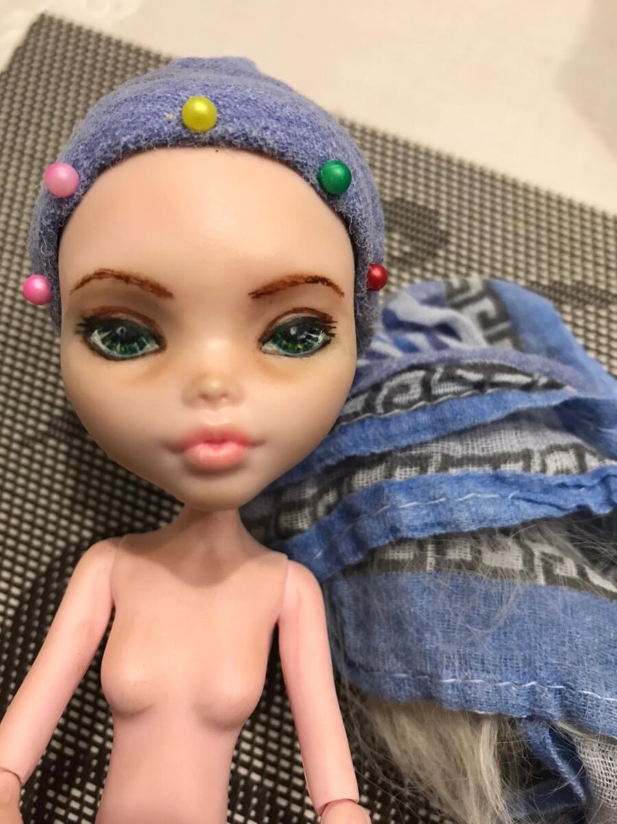После удаления заводской печати, под краской на губах Эбби обнаружилось желтое пятно. И на затылке. Если с затылком не так страшно, под волосами видно не будет, то на губах – не очень хорошо. Что с этим делать – пока не решила. В уксус с белизной не сунешь, личико голубое, цвет изменит. Оставила пока так. Или закрашу, или посмотрю в интернете что можно сделать