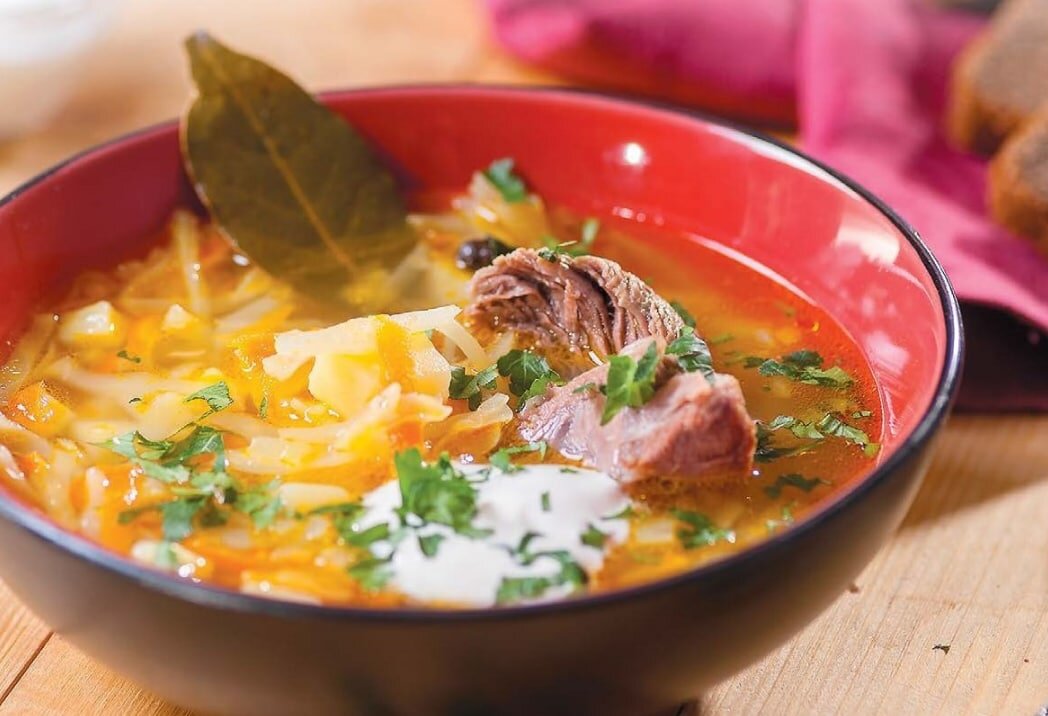 Щи из свежей капусты Ингредиенты: •Капуста белокочанная 1 кочан •Свинина 700 гр. •Картофель 3 шт. •Томаты в соку 150 гр. •Морковь 1 шт. •Лук репчатый 1 шт. •Петрушка 1 пучок •Укроп 1 пучок •Чеснок 3 шт. •Сметана по вкусу •Соль по вкусу •Перец чёрный молотый по вкусу •Лавровый лист 1 шт. •Масло растительное 2 ст.л. Приготовление: 1. Перед тем, как отварить мясо свинины, хорошо его промываем. В кастрюлю наливаем 2,5 л. воды, кладем в нее свинину и ставим на огонь. Доводим ее до кипения, снимая образовавшуюся пенку, и продолжаем варить 2 часа на умеренном огне. 2. Очищаем овощи. Лук, а также морковку нарежем тонкими полосками. Дольки чеснока режем на небольшие пластинки. Картофелины будем нарезать на небольшие квадратики, кладем их в тарелку с водой. Капусту промыть и покрошить кочан до кочерыжки. 3. На сковороде разогреваем растительное масло, выкладываем лук, морковь и жарим примерно 5 минут, после этого добавляем к массе томаты в собственном соку, мешаем и тушим 5 мин. 4. Вынимаем го