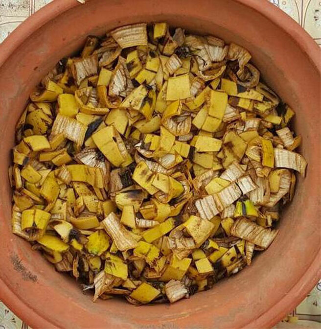 Кожуру банана следует добавлять в компостные кучи, она обогащает компост фосфором и калием. Это важно, потому что азот и углеродные «фракции» часто доминируют в компосте. В дополнение к непосредственному добавлению шкурок, полезно поливать кучу экстрактами из банановых корок.
