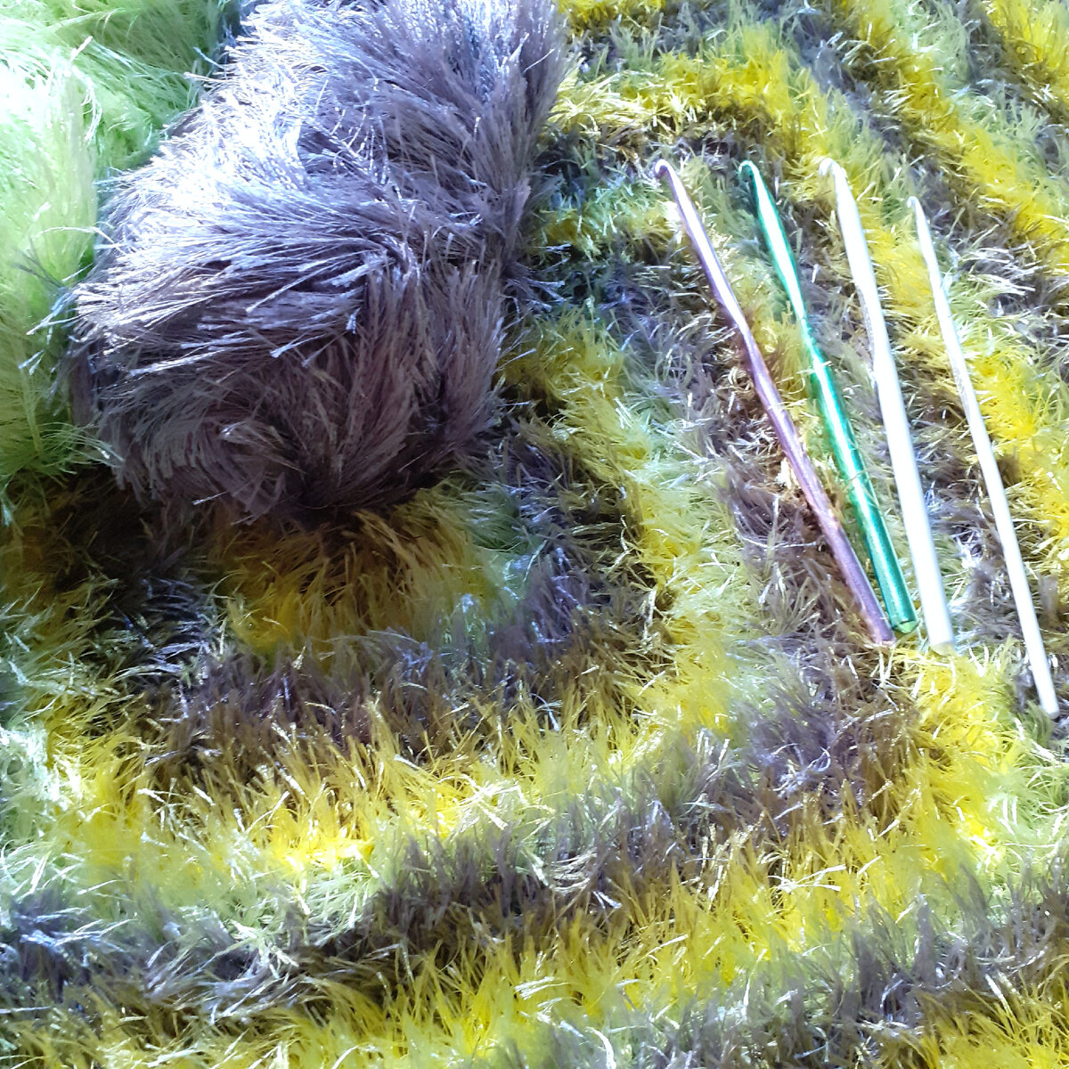 К пушистой пряже неравнодушна... Привлекает визуально и приятна на ощупь несмотря на то, что по составу она, как правило, синтетика. Одежду из пряжи типа «Травки» и «Ализе Пуффи» вязать не рискнула бы. А вот разные аксессуары, интерьерные вещички… Почему бы и нет? Покажу вам, как и что вязала))) Коврик из "Травки" четырёх цветов Вяжется коврик по спирали простыми столбиками с накидом (ссн). Идею взяла из книги Ю. Гендиной «Уютная геометрия. Модные техники вязания крючком для стильного интерьера». Техника настолько проста, что идеально подходит для вязания фактурной пряжей типа «Травки». Как вязать В кольцо амигуруми сделайте по 3 вп+3 ссн от четырех мотков разного цвета. 2-й ряд продолжайте вязать по спирали, начиная со ссн над цепочкой из 3 вп. Чтобы формировался квадрат, на 2-х петлях каждого угла вяжите 2 ссн и 1 сс2н + 1 сс2н и 1 ссн или 1 ссн и 1 сс2н + 2 ссн и 1 сс2н. Квадрат не будет перекашиваться, если данные две группы прибавок чередовать по очереди в каждом ряду. Таким образ