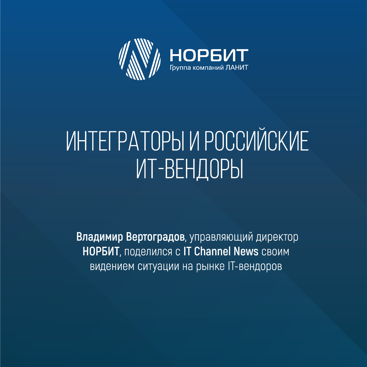 IT Channel News: Интеграторы и российские ИТ-вендоры: сотрудничество «по необходимости» или новые возможности? Часть I Комментарий Владимира Вертоградова, управляющего директора НОРБИТ (входит в группу ЛАНИТ). IT-эксперты обсудили, как экосистема реагирует на новые рыночные реалии, есть ли отечественные вендоры, решения которых конкуренты не только на российском, но и на мировом рынке, в чем их главные преимущества. Владимир Вертоградов, управляющий директор НОРБИТ (входит в группу ЛАНИТ), выделил категории продуктов, где российские вендоры активно конкурируют с западными компаниями, — это, в частности, ИБ, BI, BPM. Главными плюсами, по его мнению, являются лучшая интеграция с государственными сервисами, серьезная вовлеченность в доработку продукта, а также глубокая работа с русским языком, чрезвычайно важная для эффективности таких инструментов, как чат-боты, голосовые помощники и поисковые системы. Также он подчеркнул, что, разрабатывая решения, отечественные специалисты учитывали оп
