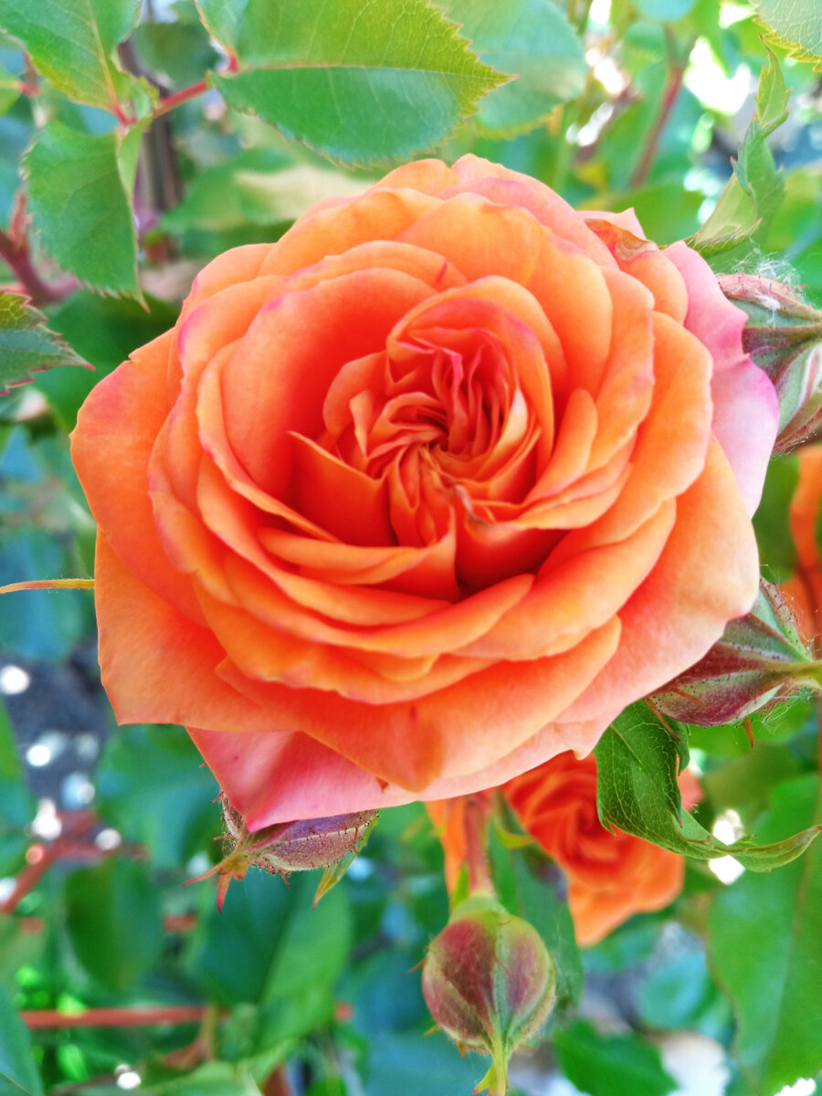 Помнится к нам в магазин привезли саженцы роз, а магазин то продуктовый. Там они провалялись, все засохли и их списали. Выкидывайте, говорят. А я смотрю, что то там ещё зелёное. И забрала домой. Посадила в горшок. Долго роза болела, но в итоге выжила. Да так и осталась в горшке, только в побольше пересадила. Меня удивила эта роза. Когда началось цветение, сначала было немного цветов. Но сами цветы удивительные. Они очень махровые, даже когда полностью открываются - превращаются в лепёшку, а серединку не видно. Даже не расковырять. Такой плотный цветок. Но самое удивительное не это. Цветок не опадает. Стоит ярко оранжевый, потом начинает светлеть, светлеет, но не опадает. В конечном итоге, цветок просто засыхает целиком. Берёшь пальчиками и снимаешь. Ни одного лепестка на землю не падает. Келли не боится жары, не боится дождей. Дождь никак вообще не отражается на цветах. Высохли и всё. Не опадения, ни гнили, для меня это просто идеально. Ну и конечно соцветия. Келли образует соцв