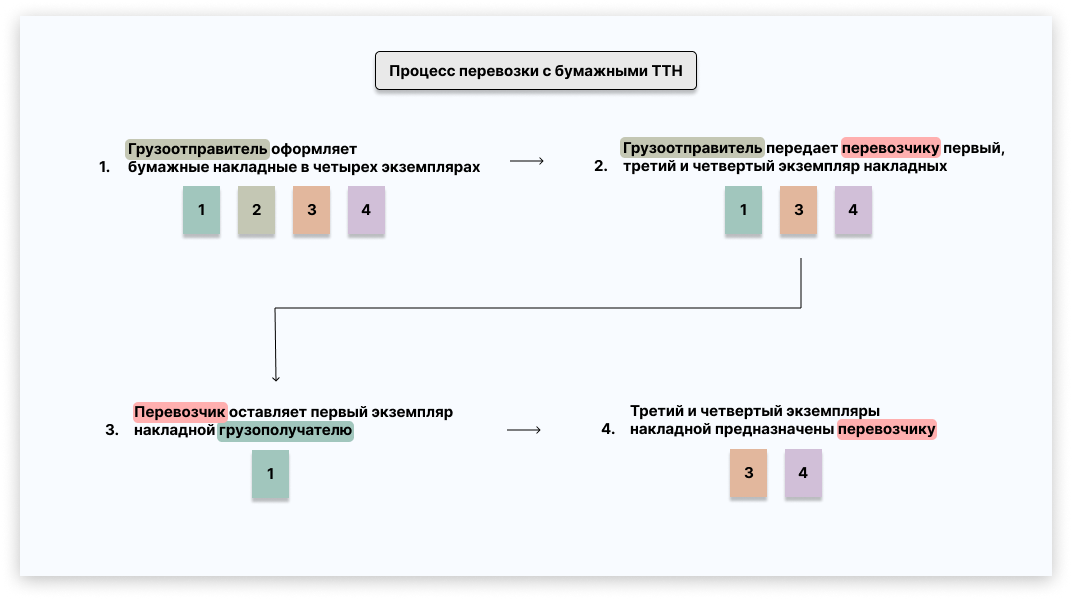 Для осуществления грузоперевозки от юридического лица необходимо оформлять товарно-транспортные накладные (ТТН) по законодательству Республики Беларусь. Начнем с бумажных бланков ТТН: Как происходит движение ТТН в процессе перевозки: Большинство используют ТТН в бумажном виде на бланках строгой отчетности. Все четыре экземпляра накладной нужно правильно заполнять. В случае допущения ошибок при их заполнении нужно правильно вносить изменения или отправлять на утилизацию. Бывают потери бланков ТТН. Все эти случаи нужно зафиксировать в специальном реестре и хранить эту информацию до налоговой проверки и месяц после нее. Электронные ТТН и Реестр эТТН Альтернатива использования бумажных ТТН - электронные накладные. Как перейти на эТТН и ознакомиться с преимуществами по ссылке: ▶ Сервис по обмену электронными накладными (эТТН/эТН). Схема движения эТТН при грузоперевозке следующая: При создании электронной товарно-транспортной накладной в электронном виде создается Реестр товарно-транспорт