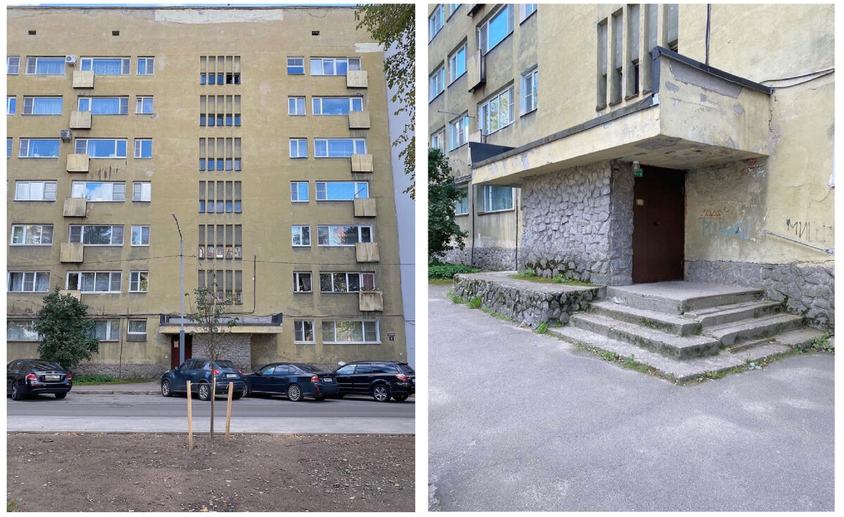 Когда я останавливалась у этого дома, была уверена, что это финский функционализм 1930-х годов. Потом уже, фотографируя и рассматривая детали, у меня появлялось все больше сомнений. Мне нравится подмечать детали в подобных неоднозначных строениях, поэтому я устроила опрос, что мешает подписчикам отнести этот дом к постройкам 1930-х годов. На первом месте по количеству ответов оказались длинные окна квартир. Смущали «французские» балконы, этажность, пропорции дома, похожие на типовые советские проекты. Кто-то писал, что окна лестничных клеток - архитектура брутализма (класс!) Другие заметили типичную советскую отделку камнем (внешний вид именно этой) и два входа: в парадную и для мусоропровода. Мусоропроводы были в домах 1930-х, но, действительно, выглядели они не так и никакой двери на первом этаже не могло быть. А вот этажность и окна меня не особо смутили. Например, в доме страховой компании «Карьяла», построенном в 1939 году целых 10 этажей и тоже довольно вытянутые окна, хотя в