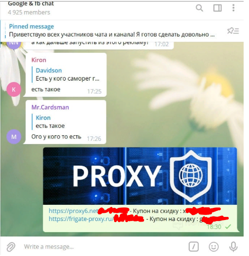 Я использовал прокси от frigate и Proxy6. А вот у первых чаще всего прокси с ГЕО России и у вторых уже есть другие страны по всей планете. В основном предпочтение отдаю второму сайту, но иногда бывает и так, что качество одинаковое. Кто знает — качество определяется порядочностью поставщиков: действительно ли индивидуальные прокси или их продают многим сразу. Могу оценить скорость выполнения работ. Для обоих сервисов есть партнёрские программы с помощью которых я и зарабатываю. И прежде чем я продолжу, скажу важную новость! У меня есть ТГ канал, там я публикую статьи с Дзен, различные курсы, а также кейсы, которые тут публиковать нельзя. Ссылка на канал, а так же в конце статьи. Приятного прочтения! Условия дают такие: у proxy6 — привлекаете по реферальной ссылке пользователей и получаете 30% со всех их покупок. У frigate 20% с покупки серверных прокси и 10% с покупки мобильных. Распространять ссылки на прокси было решено по чатам в Telegram, где могли бы обитать те, кому нужны прокси.