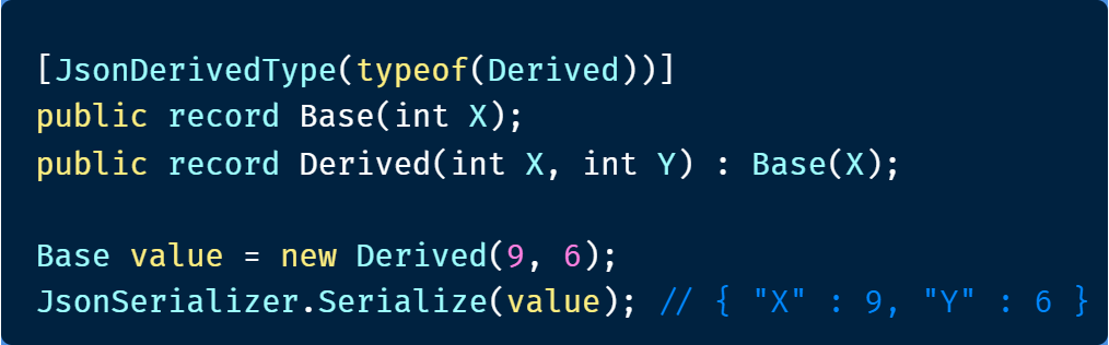 Вышел .NET 7 Preview 5! Время посмотреть на нововведения этой версии. Полиморфизм в System.Text.Json Одним из больших недостатков STJ в сравнении с Newtonsoft.Json.Net было отсутствие возможности использовать полиморфизм в моделях. Теперь можно делать так: Чтобы использовать полиморфизм при десериализации, нужно определить дискриминатор типа, который будет использоваться в JSON-предтавлении: В качестве дискриминаторов можно использовать и целочисленные значения: Копирование байтового представления в UTF-8 и UTF-16 из Utf8JsonReader без создания новой строки Раньше Utf8JsonReader.GetString() был единственным способом, которым пользователи могли получить JSON-представление строки из Utf8JsonReader. Этот метод всегда создавал новую строку, что может быть нежелательно в критичных к производительности сценариях. Теперь появилась возможность скопировать UTF-8 или UTF-16 представление json в существующие byte[] и cahr[]: В source generator для STJ добавлена поддержка IAsyncEnumerable<T>, Json