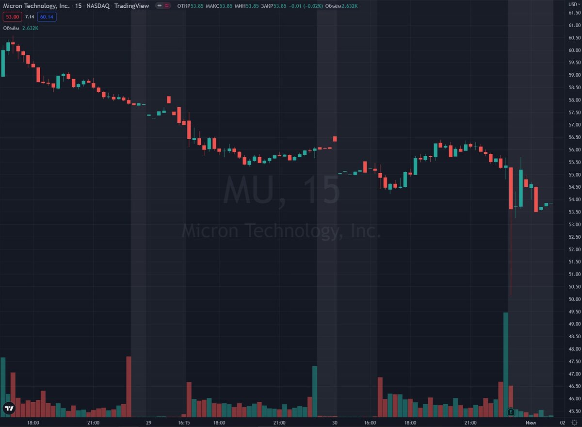 После закрытия рынка Micron Technology $MU выкатила квартальный отчет. Финансовые результаты работы компании оказались лучше ожиданий аналитиков, как по выручке, так и по чистой прибыли. Однако, инвесторам не понравились прогнозы Micron Technology на следующий отчетный период и акции с тикером MU просели на 2,8%. Комментируя скромные прогнозы, Санджай Мехротра, президент и главный исполнительный директор Micron Technology, сказал, что падение спроса на полупроводники это временное явление и в долгосрочной перспективе его компания продемонстрирует отличные финансовые показатели. Это вполне возможно, но среднесрочные трейдеры и инвесторы видят как сейчас падает все, что связано с полупроводниками и поэтому предпочитают вкладывать деньги в акции других компаний.