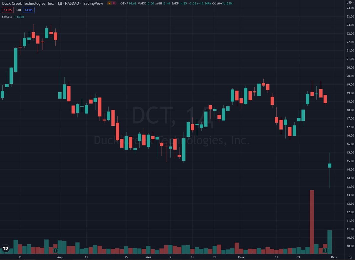 По результатам прошлой торговой сессии акции Duck Creek Technologies $DCT рухнули на 19,3% и обновили личный антирекорд. Катализатором падения стали убытки, о которых компания сообщила в квартальном отчете, и слабые прогнозы на следующий отчетный период. Кстати, именитые аналитики считают, что бумажки Duck Creek восстановятся. Например, вчера RBC Capital подтвердило для них рекомендацию «покупать» и установило целевую цену $18. Ребята из Raymond James тоже рекомендуют брать акции Duck Creek, но с целевой ценой $18,40. Только это не значит, что в Duck Creek нужно лить деньги. Подождите пока на графике появится внятный уровень поддержки, где покупатели будут поставлять крупные биды.