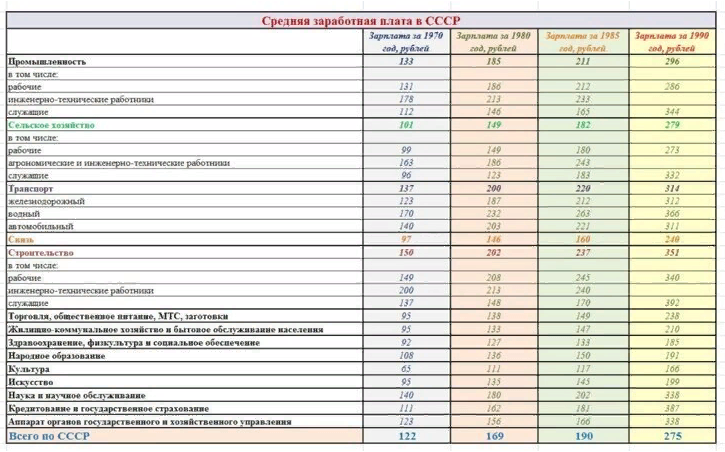 То есть, согласно данным таблицы, зарплата по сравнению с 1970 годом в 1990 году выросла по всем отраслям и категориям почти в 3 раза. Однако. как я писала в предыдущей статье, покупательская способность населения резко упала, т.к. был искусственно создан дефицит продуктов к 1985 году. Талонная система, введенная Горбачевым в 1987 году стабилизировала наполнение товарами полок магазинов. Но в 1991 году произошел развал СССР, цены подскочили, т.к. были спущены в свободный рынок. Зарплаты вовремя не платили. Покупательская способность упала.
