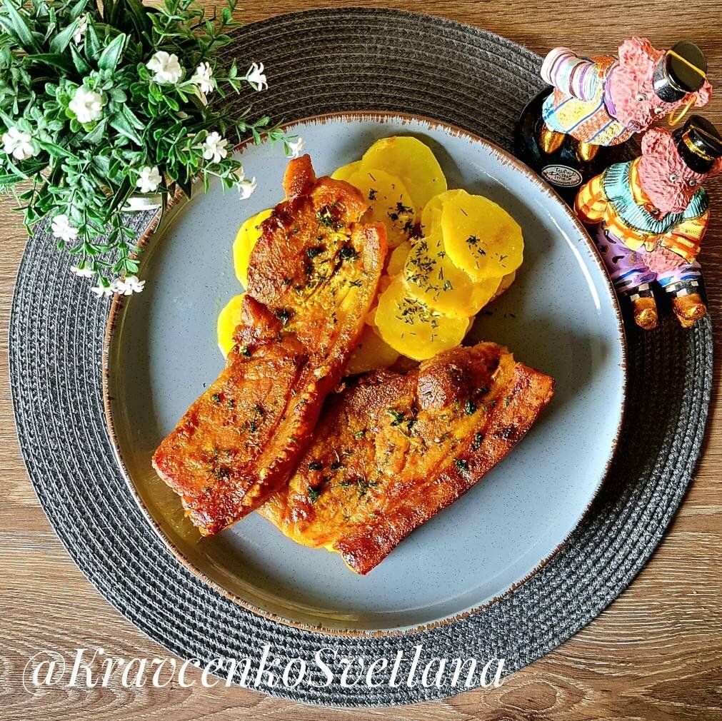 Именно маринад придает мясу особый вкус и аромат, делает его сочным и нежным. Ингредиенты: свинина, картофель, для маринада, куркума, паприка сладкая, красный перец чили, растительное масло, соль, перец, лук, цедра лимона Способ приготовления: На терке натереть лук, добавить куркуму, паприку, красный перец чили, молотый перец, соль, растительное масло и цедру лимона, все перемешать. Натереть мясо полученным маринадом, оставить на пару часов. Картофель почистить и нарезать слайсами. Форму смазать маслом. Выложить картофель, посолить, поперчить. Сверху на картофель - мясо. Форму отправить в рукав. Запекать при 180-200 С - 1,5 часа. Приятного аппетита!