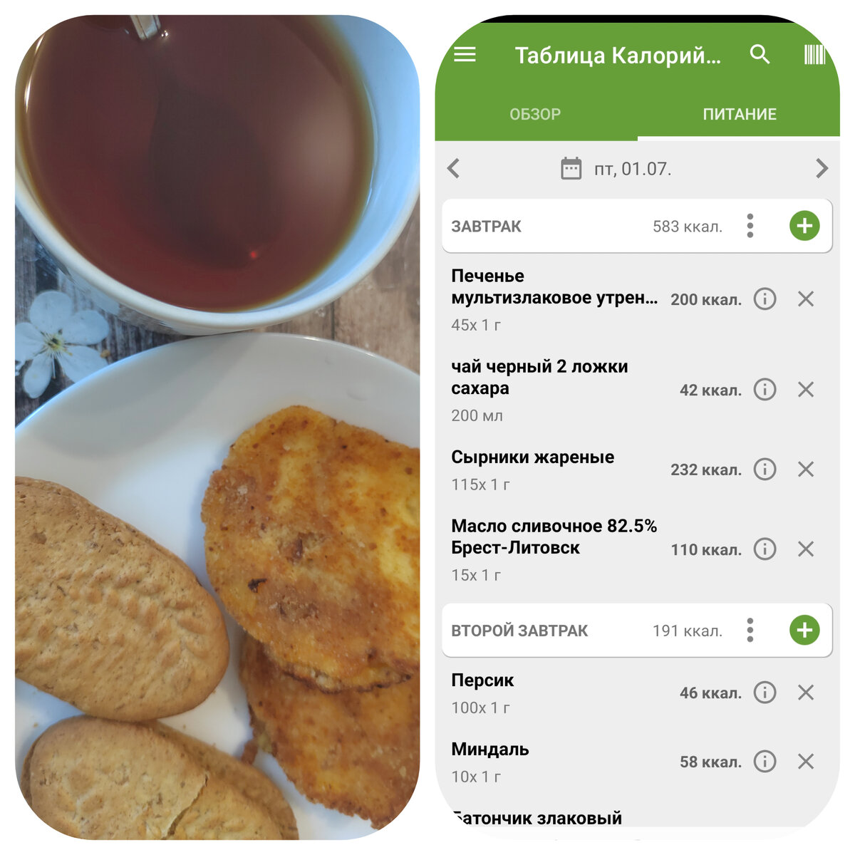 Здравствуйте, мои дорогие друзья и гости канала🤗 Для тех, кто впервые заглянул на огонек, расскажу о себе: Меня зовут Светлана, мне сорок лет и я худею вкусно на 20 кг до 31.12.2022 г. Рост мой 165 см, начальный вес 90 кг. Придерживаюсь правильного питания и считаю КБЖУ. На данный момент мой результат -8,65 кг. На своем канале я веду дневник питания, а так же делюсь понравившимися рецептами ПП и не только, рассказываю историю своей жизни. Буду рада, если вы поддержите меня лайком, подпишитесь на мой канал и очень надеюсь на обратную связь🙏🤗 Присоединяйтесь ко мне, ведь вместе веселее!!! Сегодня мой день прошел бестолково. Проснулась я в шесть, на работу как на праздник, громко гремя кандалами😂 . Есть сначала не хотелось, но к семи я вроде как проголодалась и устроила себе настоящий праздник живота. Съела два жареных сырника, печенье злаковое Утреннее со сливочным маслом и чай с двумя ложками сахара. Ну разве кто то откажется так худеть? Вот в этом и заключается вся прелесть подсчёт