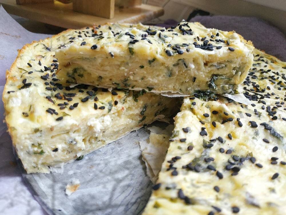 Ингредиенты: лаваша, яйця, кисломолочного сиру, твердого плавкого сиру, Зелень/сіль/перець/спеції Способ приготовления: Форму, у якій випікатимемо пиріг змащуємо олією, або викладаємо пергаментним папером. У мене форма діаметром 22 см. На дно форми довільними шматочками, викладаємо порваний, або порізаний лаваш. Беремо половинку листа, щоб він закрив дно форми. В мисці змішуємо сир, яйця, спеції, дрібно нарізану зелень. Сир тремо на тертці і гарно вимішуємо нашу масу. Лаваш, який залишився, також рвемо шматочками і вмішуємо в нашу сирну начинку. Викладаємо масу у форму, за бажанням посипаємо кунжутом і випікаємо у розігрітій до 180° духовці 25-30 хв. Мені пиріг більш смакує холодним з овочевим салатом або гарячим чаєм.