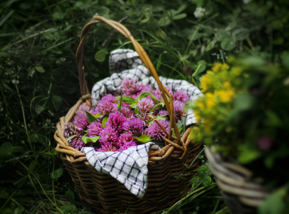 Пока цветет красный клевер, а у нас он целыми полями сейчас растёт, отправляемся с корзинкой за вкусным и полезным сырьём. Я собираю и головки клевера, и зелень, готовлю из них муку, желе, мусс, гарниры, пеку зеленые и розовые лепешки. Обязательно поделюсь рецептами, собиру их в большую подборку, а начать хочу с солнечного чая - любимого летнего напитка. Как и любые съедобные цветы, собирать красный клевер нужно в солнечный день, когда над ними кружатся насекомые. Попробуйте отделить от соцветия-головки маленький цветочек и попробуйте его. Вкус похож на цветы акации, он нежный, сладкий, с ярким ароматом цветов. Итак, свежие цветы, собранные в солнечный день, промываем холодной водой и тут же отправляем их в банку, наполняя её на половину или на 2/3. Заливаем холодной водой, закрываем крышкой и оставляем на солнце. Собственно, поэтому чай и называется солнечным - травы "завариваются" в течении всего дня под медленным и длительным нагревом. Для такого чая идеально подойдут любые съедоб