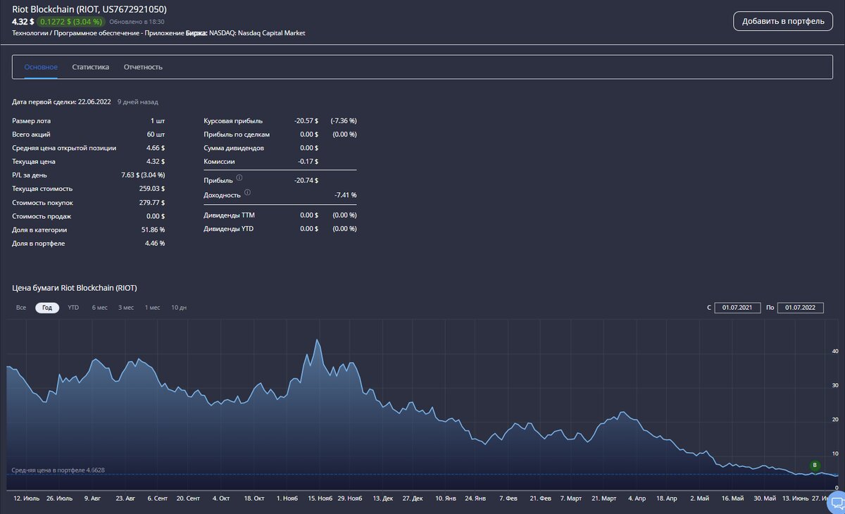 #SKAVRONSKIY 💻 Источник: https://t.me/signalloff/2481 💼 Портфель: https://intelinvest.ru/public-portfolio/381933/ 🏢 Компания: Riot Blockchain, Inc. ☑️ Инструмент: Riot Blockchain, Inc. 📌 Код инструмента: #RIOT 📅 Дата входа: 22.06.2022 г. ⏰ Время входа: 21:57 (Мск.) ❗️ Способ входа: По рынку 📈 Направление: Лонг 🔽 Рекомендованный вход: 4,64 ⏺ Точка входа: 4,66 ✅ Цель: (1) 4,90; (2) 5,15; (3) 5,50 ⛔️ Стоп: 4,30 📍 Срок: Не установлен 🔢 Количество: 60 шт. 📊 Доля в портфеле: 4,46% Источник: https://t.me/signalloff/2481 P.S.: Информация в данной статье не является индивидуальной инвестиционной, торговой или какой либо другой рекомендацией, и финансовые инструменты либо операции, упомянутые в статье, могут не соответствовать инвестиционному (торговому) профилю и инвестиционным целям (ожиданиям) читателя. Информация в статье предоставлена исключительно в целях ознакомления. Определение соответствия финансового инструмента либо операции интересам читателя, инвестиционным целям, инвести