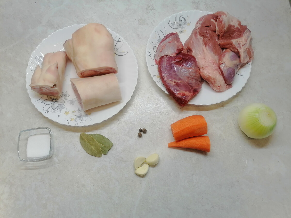 Для приготовления классического холодца понадобится: Свинные ножки обычно продаются в замороженном виде, поэтому их необходимо предварительно разморозить и хорошо промыть. Свинные ножки, лопатку, говядину, морковь и целиковую, очищенную луковицу складываем в кастрюлю и заливаем водой. Ставим на сильный огонь, накрываем крышкой и доводим до кипения. Снимаем пенку, уменьшаем огонь так, чтобы бульон слегка булькал, но не бурлил. Накрываем крышкой и оставляем на 3 часа. Через 3 часа добавляем соль, лавровый лист и душистый перец. Перемешиваем, накрываем крышкой и оставляем ещё на 30-40 минут. Далее, вытаскиваем мясо и даём ему немного остыть, чтобы его было легче нарезать. Пока мясо остывает натираем чеснок на мелкой терке или измельчаем блендером. Бульон пропускаем через мелкое сито и добавляем в него чеснок, перемешиваем и ставим на медленный огонь чтобы бульон не остыл и не покрылся плёнкой. Мясо мелко нарезаем и раскладываем в ёмкость, в которой холодец будет застывать. Поверх