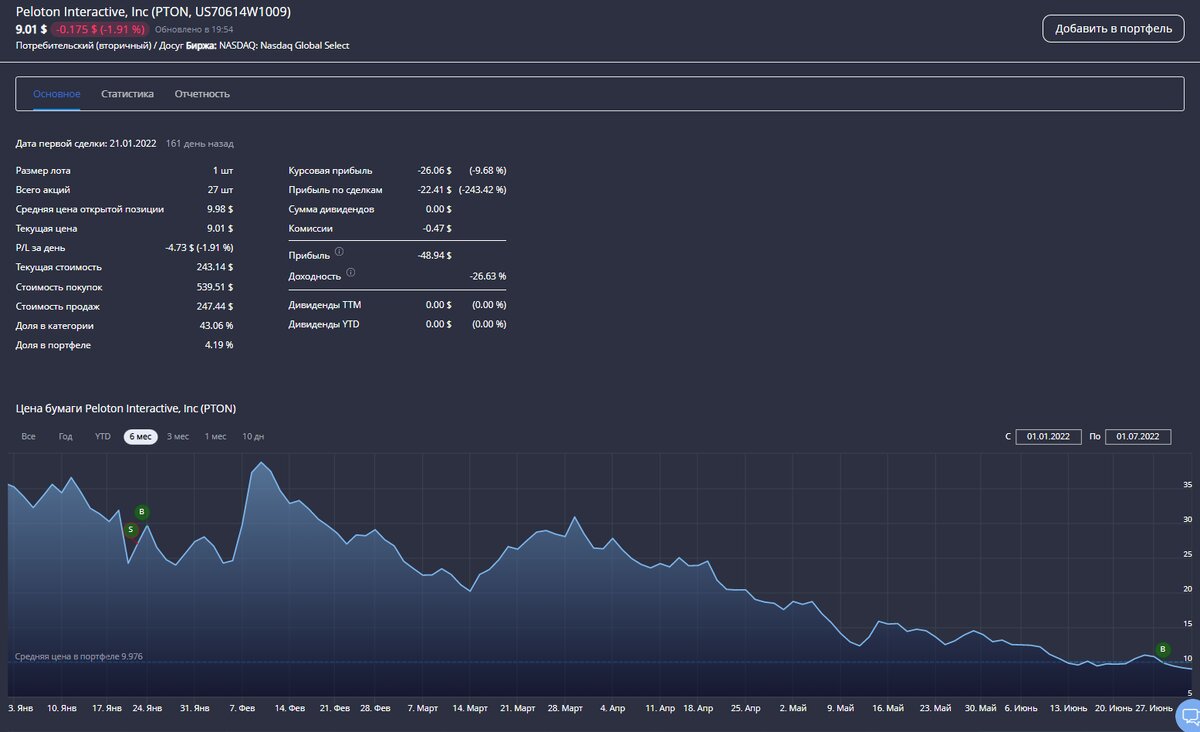 #SKAVRONSKIY 💻 Источник: https://t.me/signalloff/2484 💼 Портфель: https://intelinvest.ru/public-portfolio/381933/ 🏢 Компания: Peloton Interactive, Inc. ☑️ Инструмент: Peloton Interactive, Inc. Class 📌 Код инструмента: #PTON 📅 Дата входа: 28.06.2022 г. ⏰ Время входа: 21:59 (Мск.) ❗️ Способ входа: По рынку 📈 Направление: Лонг 🔽 Рекомендованный вход: 9,96 ⏺ Точка входа: 9,97 ✅ Цель: (1) 10,70; (2) 11,50; (3) 12,45 ⛔️ Стоп: 9,32 📍 Срок: Не установлен 🔢 Количество: 27 шт. 📊 Доля в портфеле: 4,19% Источник: https://t.me/signalloff/2484 P.S.: Информация в данной статье не является индивидуальной инвестиционной, торговой или какой либо другой рекомендацией, и финансовые инструменты либо операции, упомянутые в статье, могут не соответствовать инвестиционному (торговому) профилю и инвестиционным целям (ожиданиям) читателя. Информация в статье предоставлена исключительно в целях ознакомления. Определение соответствия финансового инструмента либо операции интересам читателя, инвестицион