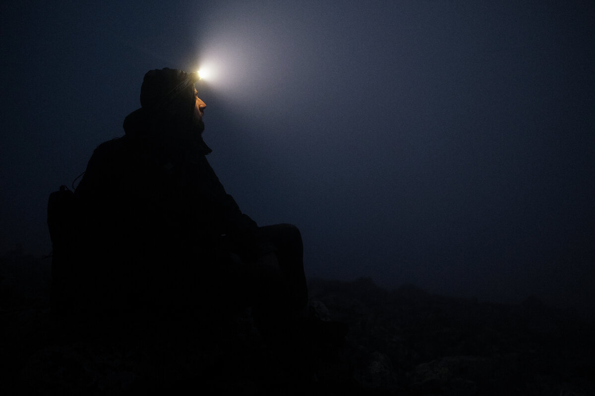 Было необыкновенно тихо. Забравшись чуть выше сделали передышку. Мы выключили фонари, и увидели очертания камней сквозь завесу тумана. Всё вместе — тишина и вид, создавали таинственную атмосферу. Находиться посреди этого, быть в этом моменте — уже было достаточно для того, чтобы оправдать ранний подъём и испытанный в связи с ним дискомфорт. Надежда на то, что вершина будет чистой, а туман останется внизу, нас не покидала. Чем выше мы поднимались, тем плотнее станови