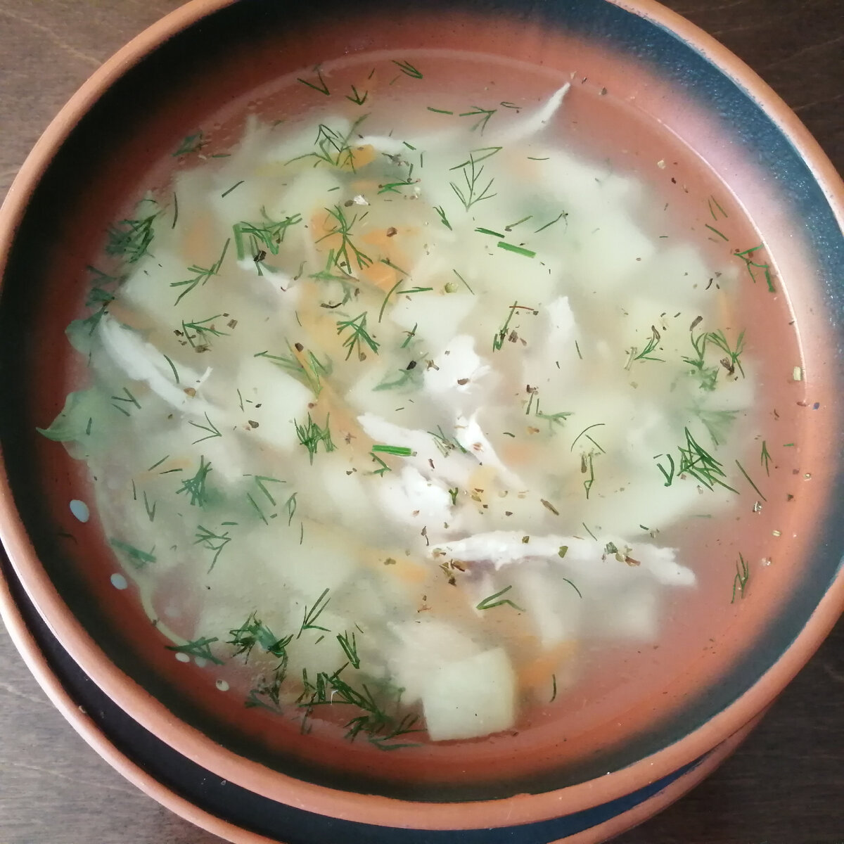 - Всем хороших выходных! Что приготовить на обед? Лёгкий, вкусный, диетический суп будет очень кстати и в летний день. На объем 1,5 литра: 1) куриное филе 2-3 шт. 2) картофель 2 шт. большие 3) вермишель 2 - 3 ст. л. 4) морковь 1/2 средней 5) луковица небольшая 6) соль. 7) перец чёрный молотый или смесь перцев. 8) зелень (укроп, петрушка) по Вашему вкусу. Можно добавить приправу "Кавказские травы", совсем чуть-чуть, она придаст блюду необычную ноту! Филе варить 20 мин. после закипания, затем вынуть из бульона. Картофель нарезать кубиком положить в бульон и дать покипеть 2 минуты. Посолить. Мелко порезать лук и натереть морковь, положить все это в кастрюлю, и варить на медленном огне до готовности картофеля. Мясо разобрать на волокна и отправить к нашим овощам. После чего добавить вермишель, приправу "Кавказские травы" или другую по-вкусу, щепотку чёрного молотого перца. Блюдо довести до вкуса и дать покипеть 1 минуту. Зелень нарезать, положить в наш суп и сразу выключить. Не нужно чтобы зелень кипела вместе с супом, за счёт высокой температуры она потеряет цвет, а суп наоборот, приобретёт зелёный оттенок. Поэтому, ароматную травку кладут в самом конце приготовления и сразу завершают процесс готовки. Приятного аппетита!