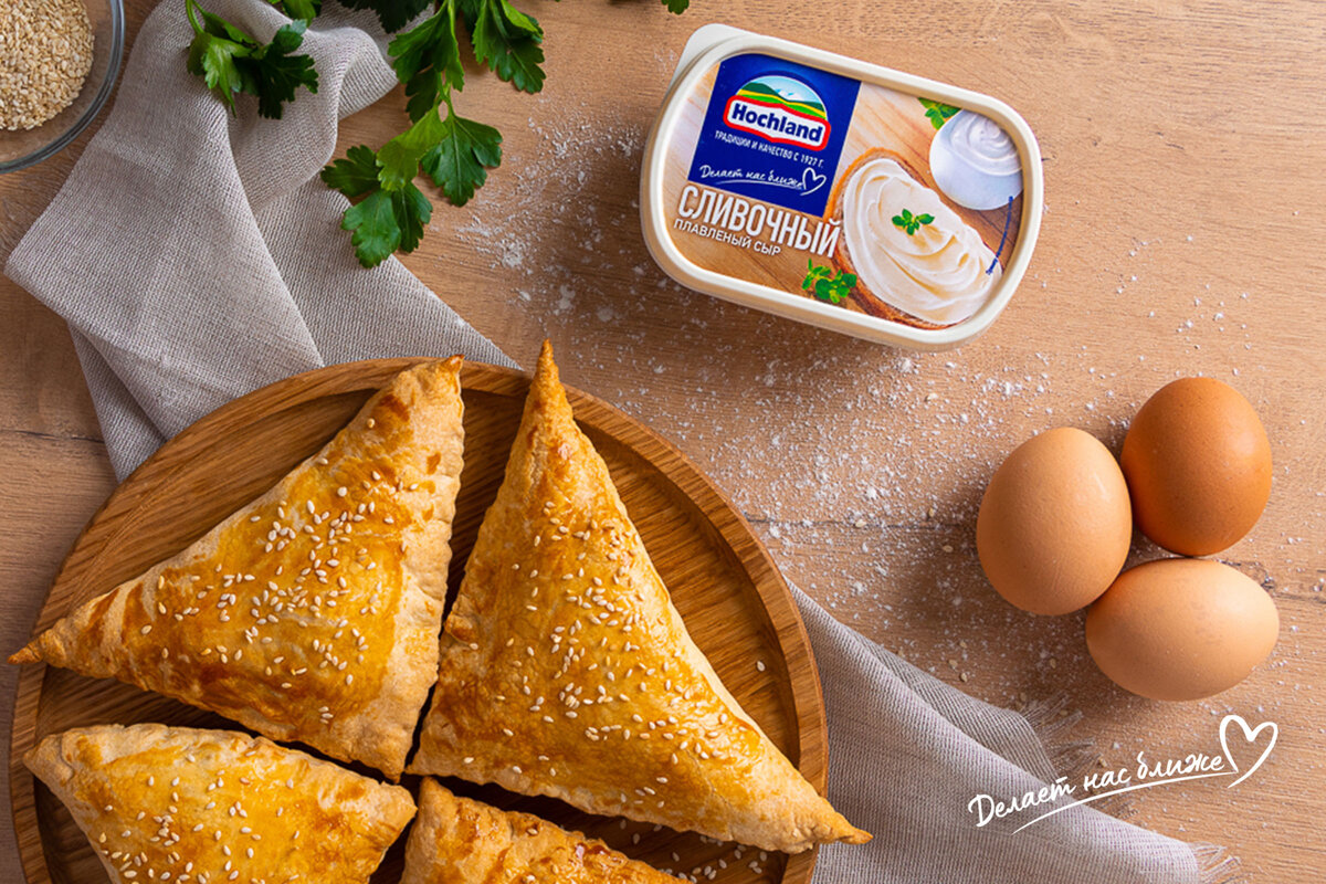 Встречайте новый семейный рецепт! Все в восторге от него: и взрослые, и дети. Это конвертики из слоеного теста с плавленым сыром Hochland и ветчиной. Готовить их легко и быстро. Следуйте рецепту и вдохновляйтесь на новые кулинарные шедевры. Вам понадобится: Пошаговый план: 1. Приготовить начинку для слоек. Ветчину нарезать тонкими полосками. Зеленый лук измельчить по диагонали. 2. Готовое слоеное тесто разморозить, раскатать и нарезать на квадратики. Сильно тесто размораживать не нужно, иначе будет тяжелее готовить. 3. Каждый квадратик теста раскатать скалкой. В центр выложить кусочки ветчины, плавленый сыр и зеленый лук. 4. Взять два противоположных краешка квадратика и завернуть их к центру, после тщательно защипнуть слойку. То же самое проделать со всем тестом. 5. Выложить слойки на противень, проложенный бумагой для запекания. Яйцо взбить, сверху смазать кисточкой слойки и посыпать кунжутом. 6. Выпекать слойки в предварительно разогретой духовке до 180 градусов 15-20 минут до готов