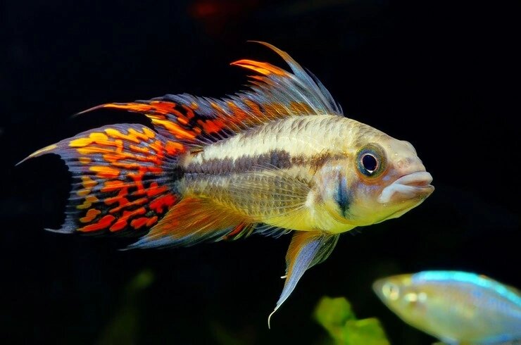 Одна из ярчайших представителей южноамериканских цихлид, способная украсить собой любой пресноводный аквариум. Помимо красивой окраски обладает и другими достоинствами — простотой в содержании, неприхотливостью, дружелюбным нравом. Может быть рекомендована начинающим аквариумистам. Взрослые особи достигают в длину около 5–7 см. Самцы несколько крупнее и обладают крупным спинным плавником, напоминающим гребень, окрашенным в яркие огненные цвета, подобную окраску имеет и хвост. Самки заметно меньше и окрашены гораздо скромнее самцов. В домашнем аквариуме в рационе питания желательно предусмотреть живые или замороженные корма, например, мотыль, дафнии, артемии. Однако, зачастую рыбки приучены к сухим тонущим кормам в виде хлопьев или гранул с большим количеством протеина в составе. Вполне миролюбивая спокойная рыбка, может уживаться с большинством видов схожего размера и темперамента. Во избежание возможных внутривидовых конфликтов стоит ограничится одним самцом в компании с нескольки