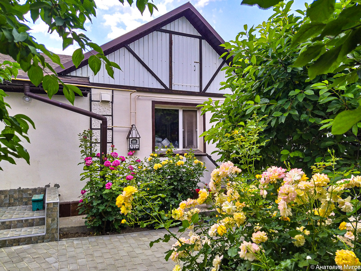 У нас розы цветут, самый пик цветения первой волны. Вторая волна будет слегка поскромнее, а сейчас просто праздник души. Шесть лет прошло, как мы переехали в тихий городок Старый Крым. В первый год ударными темпами занимались реконструкцией дома. А потом уже не спеша доводили дом до ума и приводили в порядок территорию. Изрядно наше домовладение изменилось за это время. Сейчас покажу, как было и как стало. Так выглядел главный фасад нашего дома в январе 2016 г., Мы только-только прибыли сюда на ПМЖ. Дом был не газифицирован, так что первым делом купили дрова и уголь. Главный вход в дом сегодня. Под окном мы посадили розы. Синие птицы на фасаде - это сделала Лена. А пряничный домик - это газовый счетчик, моя работа. Газ нам провели очень быстро, всего за два месяца. Так что в следующую зиму дрова нам уже не понадобились. В первый же хороший дождь мы обнаружили, что наш двор заливает водой, без резиновых сапог никак. Первый вариант благоустройства парадной части двора, а также дренажную