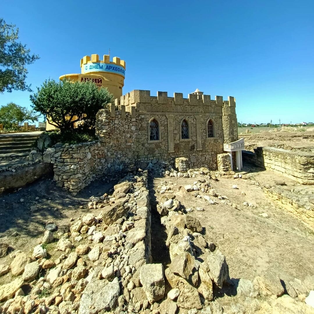 Дорога вдоль Чёрного моря, вдоль Каламитского залива, прекрасна, особенно, когда солнце играет на поверхности голубого моря солнечными зайчиками и отбрасывает их в редкие белые как снег облака. Справа море, а слева где-то вдалеке за железной дорогой розовый Сасык-Сиваш. Между морем и озером на холме стоит одинокая желтая башня, с которой далеко видно и море, и окрестные степи. В этой башне расположился небольшой музей Кара-Тобе, в котором можно услышать интересный рассказ о далёком и совсем не таком далёком прошлом, о скифах и греках, о советском периоде и о будущем… Здесь старые стены и постройки под прошлое соседствуют друг с другом. У построенной уже после Великой отечественной войны башни прилепилось строение стилизованное под древне-греческое, а внизу у подножия уже настоящая древность... Почти у самого входа стоял человек, он, увидев мой интерес, отправил меня к девушке, расположившейся за столиком под раскидистым деревом. Она продавала билеты на экскурсию. Стоимость посещения м