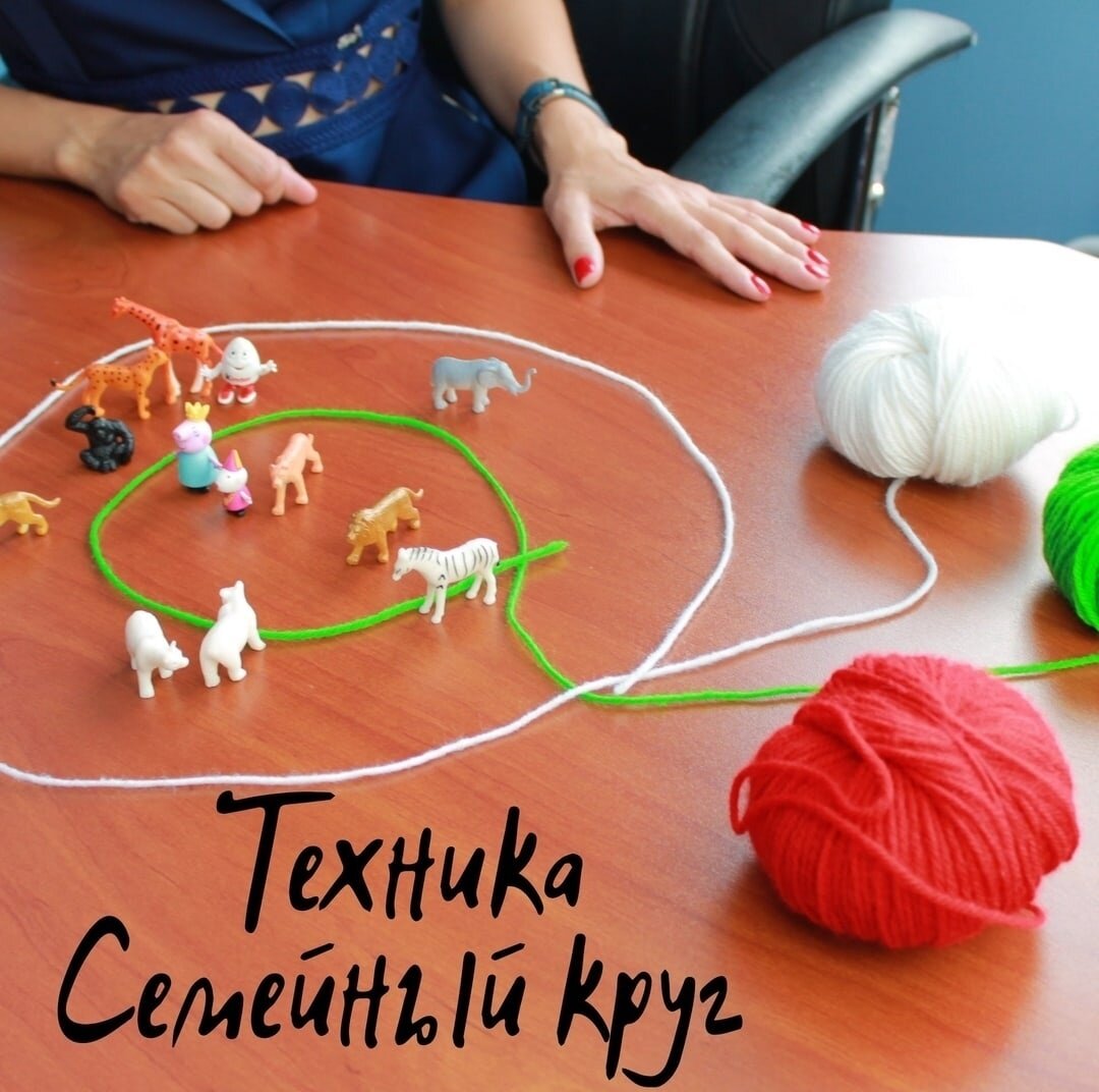 🍃 Клиент выставляет, из предложенных психологом разных фигурок, себя, своих родных и близких в круги: ближайший круг, второй круг и т.д. Круги делаются из ниток разного цвета. И клиент расставляет фигуры так, как он видит свои отношения, кто-то ближе, кто-то дальше.