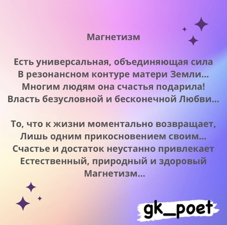 Пульс: 20 июня – 24 июня: 15-й Генный Ключ переходит от Тени Серости к Сиддхи Цветения, и это Путь Магнетизма. Вечно цветущая Весна «Можно обобщить Дар Магнетизма как силу влиять на ауру. Магнетизм - это сила ауры. Как говорил Гёте: «Все живое создаёт вокруг себя атмосферу.»Все формы жизни излучают биоэнергетические поля, которые взаимодействуют со средой через геометрические законы. Именно этот 15-й Дар открывает силу ауры вести и передавать информацию между различными формами. Чем более резонансной становится ваша аура с природными частотами Земли, тем шире распространяется ваша аура, приводя вас в контакт со многими скрытыми реальностями и царствами внутри природы. В конечном итоге, по мере того, как частота вашей ауры приходит в совершенный резонанс, она соединяется с самой земной сеткой, и ваше сознание расширяется в геометрическом масштабе, становясь единым с планетой Земля и всем Мирозданием.» Отрывок из книги «Генные Ключи». R. Rudd Продолжение в карусели 👆🏻 #gk_poet #