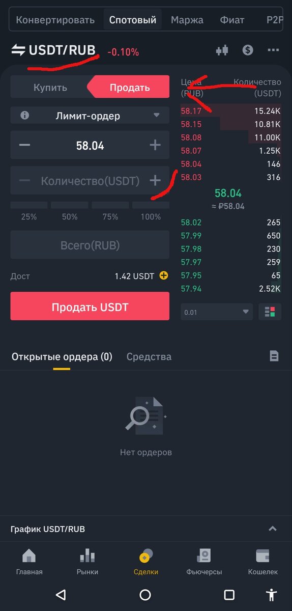 Вы можете обменять криптовалюты на платформе Binance P2P мгновенно и безопасно! Шаг третий. Обратите внимание. Если в списке на обмен Р2Р не будет вашей валюты ( Об этом ниже), то это необходимо. В ином случае не нужно заморачиваться, если ваша основная цель обмен а не торговля! Но это также я считаю важным знать! Переходим во вкладку "Сделки". Выбираем обмен USDT/RUB; "Продать". Выбираем количество долларов, что хотим потом обменять на Р2Р. В общем продаем рубли покупаем доллары. 4. Шаг четвертый. Возвращаемся на главную страницу. Переходим на Р2Р. Откройте приложение в браузере или на любом девайсе. Читаем внимательно все уведомления о рисках. Например, что не стоит отправлять деньги до того как продавец не перевел вам и что граждане РФ не могут иметь больше 10.000 евро. Выбираем продать. Как нам видно доступна не вся валюта, потому так необходимо свой "Фиат" иногда поменять не обязательно на USDT. Также подойдут валюты из списка: ( USDT; BTC; BUSD; BNB; ETH; RUB; SHIB.)