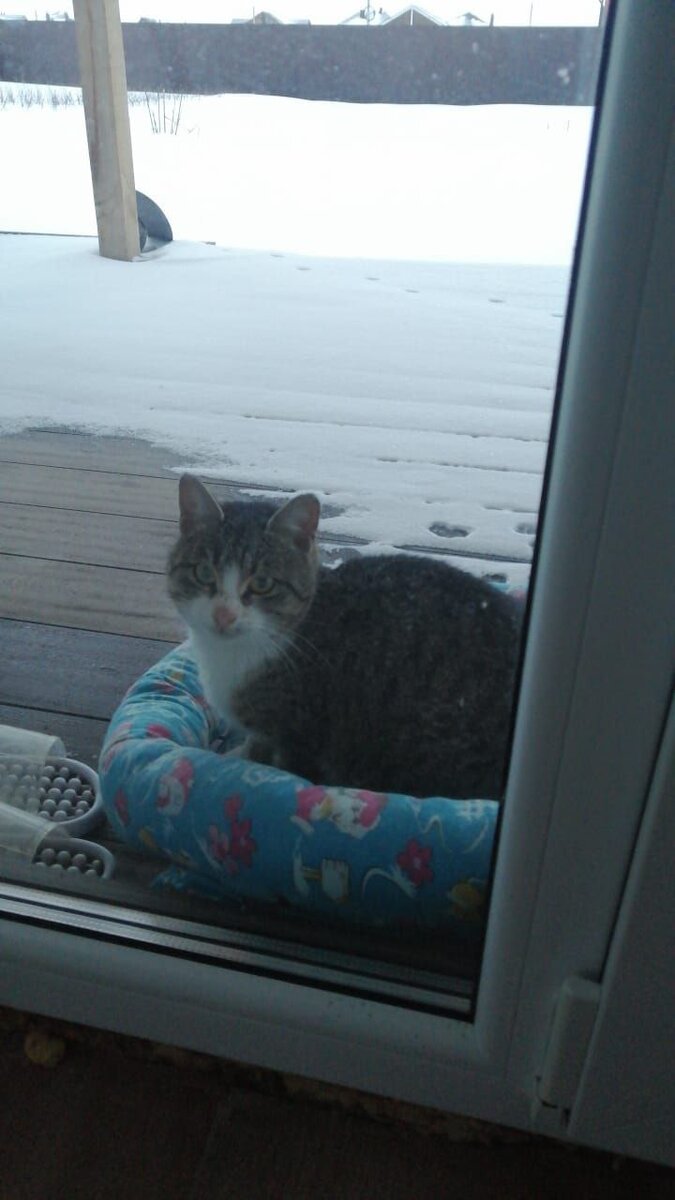 Стояла промозглая холодная зима. Вместо искрящегося похрустывающего от мороза снега под ногами была белая каша, и от этого казалось вокруг все ещё более серым и мокрым. Был уже поздний вечер, когда одна из наших волонтёров вдруг заметила за окном какую то тень. Сначала подумала, что показалось, но когда вдруг её домашняя кошка начала метаться около окна, девушка поняла, что там кто-то есть. Открыв двери на зимнюю веранду, увидела, как на крылечке сидит, сжавшись в комочек, напуганная несчастная кошечка. Позвав её, кошка сразу подбежала и стала ласкаться, не веря своему счастью, что её не прогнали. Накормив малышку, постелили ей на время лежачок, так как была уверенность, что эта кошка чья-то из посёлка, что сейчас поёт и уйдет к себе домой. Каково же было удивление, когда утром проснувшись, девушка увидела, что кошечка так и спит на лежаночке. Она никуда не ушла, так как видимо некуда было идти. Написав в чат посёлка о том, что нашлась вот такая кошечка, кто-то небрежно ответил, ч
