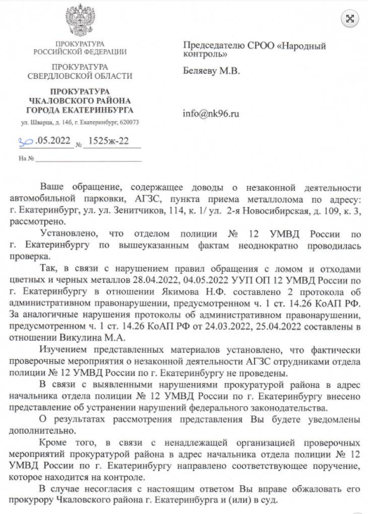Поступил ответ от Чкаловской прокуратуры города Екатеринбурга по информации из материала “Выезд РБК Екатеринбург и СРОО Народный КОНТРОЛЬ на нелегальные объекты рядом с ЛЭП и теплотрассой”. "Обращение, содержащее доводы о незаконной деятельности автомобильной парковки, АГЗС, пункта приема металла по адресу: г. Екатеринбург, ул. Зенитчиков, 114 к.1 / ул. 2-я Новосибирская, д. 109, к. 3, рассмотрено.
