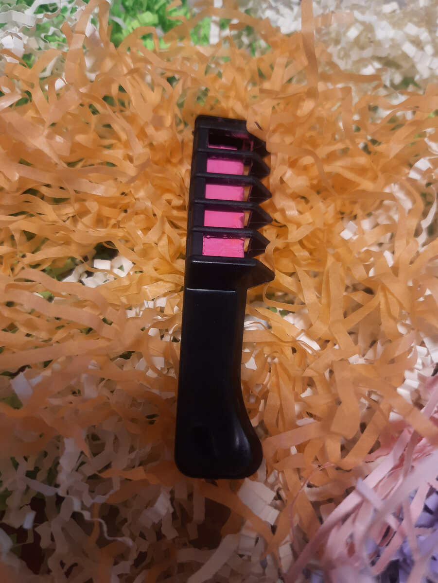 Дочка - жуткая модница и считает себя какой-то там принцессой. Не спрашивайте, она сама путается в показаниях принцесса кого и чего она. Просто я давно смирилась с фактом, что она любит длинные бальные платья, красивые прически и крутиться перед зеркалом. Когда она пришла ко мне с просьбой покрасить волосы в розовый цвет, я задумалась: почему бы и нет? Но красить тоником или краской - не наш вариант, так как волосы тонкие и слабые. Зато вспомнила, что когда-то видела тушь для волос и мелки. Нашла на Joom и заказала. Ждали больше 2-х месяцев. Дочка меня извела вопросами, когда получу заказ. Дождались. Видео распаковки я еще выложу. Мелок пришел сразу вставленный в подобие расчески. Был чуть влажный. Капельки конденсата были в упаковке. В такую расческу можно вставить другие мелки. Я уже прикинула, что можно заказать другого цвета и менять, делая пряди разноцветными. На фото цвет приглушен. На самом деле свет более яркий и больше напоминает насыщенный цвет фуксии. Пользоваться мелком