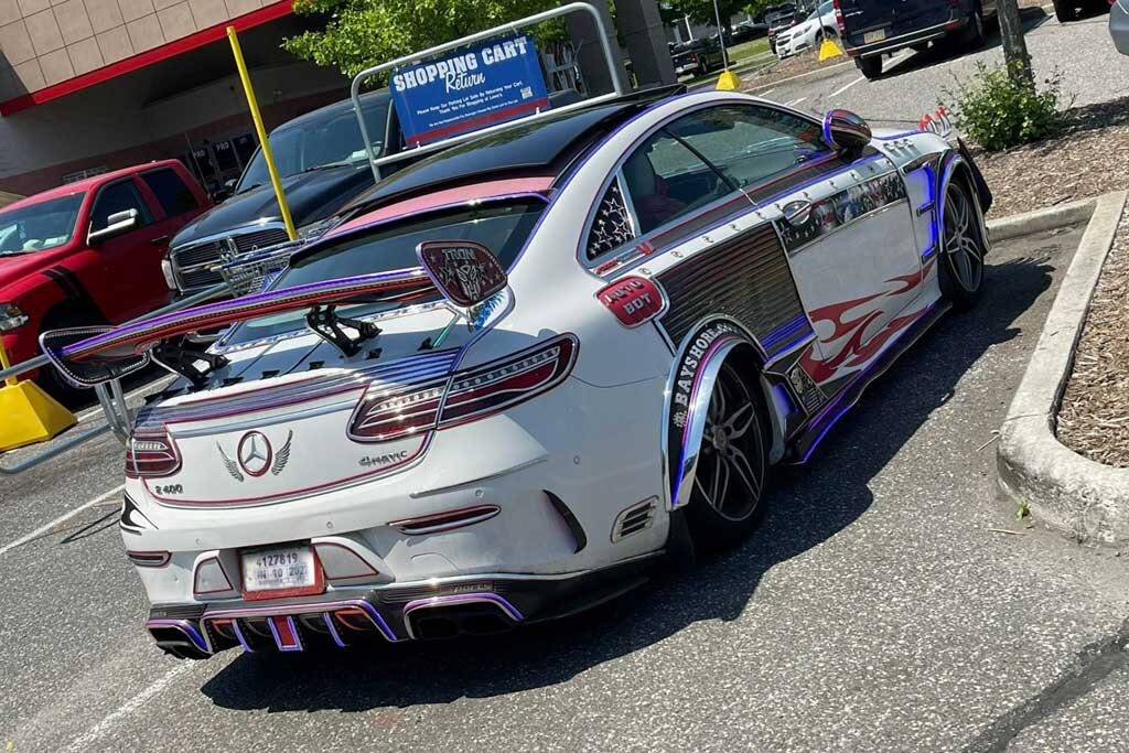 На парковке замечен причудливый Mercedes-Benz E400: яркий пример неудачного тюнинга