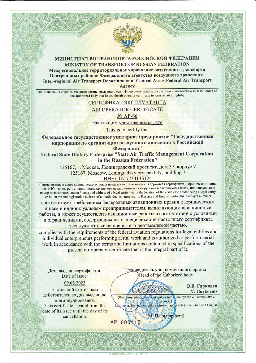 Стоит напомнить, что 9 марта 2022 года филиалом «Аэроконтроль» был получен Сертификат Эксплуатанта № АР-66 на авиационные работы в соответствии с требованиями ФАП-494. До этого авиационные работы выполнялись по Сертификату Эксплуатанта № АР-08-13-045 сроком действия до 09.08.2022.