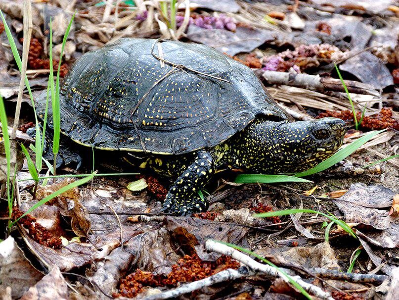 Характеристики болотной черепахи Этот вид пресмыкающихся отличается крупной головой с темной кожей, усеянной белыми или желтыми пятнами небольших размеров. Лапы у нее имеют ту же окраску. На них находятся крупные и острые когти, с помощью которых животное разрывает свою добычу на части. Форма карапакса овальная либо округлая. Цвет его бывает черным и желто-зеленым, с мелкими желтыми и белыми вкраплениями. У болотной черепахи есть длинный хвост, который может достигать длины 12 см. Как правило, у самок он немного меньше, чем у самцов. Также, самцы и самки отличаются цветом глаз – у мужских особей глаза имеют красноватый оттенок, у женских – желтый. Размеры взрослых черепах, живущих на воле, достигают 35 см. Их вес может составлять 1,5 кг. Где обитает болотная черепаха Европейская болотная черепаха бывает нескольких подвидов. Они различаются размерами и некоторыми внешними особенностями. Но чаще всего встречается разделение по областям обитания. Этот вид рептилий широко распространен.