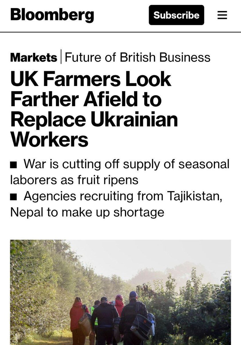 π¬ ΠΠ°ΠΊ ΡΠΎΠΎΠ±ΡΠ°Π΅Ρ Bloomberg, ΡΠΊΡΠ°ΠΈΠ½ΡΡ ΡΠΎΠ±ΠΈΡΠ°Π»ΠΈ ΡΠ±Π»ΠΎΠΊΠΈ, ΠΌΠ°Π»ΠΈΠ½Ρ ΠΈ ΠΊΠ»ΡΠ±Π½ΠΈΠΊΡ. Π ΡΡΠΎΠΌ Π³ΠΎΠ΄Ρ ΠΊΠΎΠ»ΠΈΡΠ΅ΡΡΠ²ΠΎ ΡΠ°Π±ΠΎΡΠ½ΠΈΠΊΠΎΠ² ΡΠΎΠΊΡΠ°ΡΠΈΠ»ΠΎΡΡ ΠΈΠ·-Π·Π° ΠΊΠΎΠ½ΡΠ»ΠΈΠΊΡΠ°. Π‘Π΅ΠΉΡΠ°Ρ ΡΠ΅ΡΠΌΠ΅ΡΡ Π²ΡΠ½ΡΠΆΠ΄Π΅Π½Ρ Π½Π°Π½ΠΈΠΌΠ°ΡΡ ΠΆΠΈΡΠ΅Π»Π΅ΠΉ Π’Π°Π΄ΠΆΠΈΠΊΠΈΡΡΠ°Π½Π°, ΠΠΎΠ»Π΄ΠΎΠ²Ρ ΠΈ ΠΠ΅ΠΏΠ°Π»Π°, ΠΏΠΈΡΠ΅Ρ ΠΈΠ·Π΄Π°Π½ΠΈΠ΅. Π‘Π°ΠΌΠΈ Π±ΡΠΈΡΠ°Π½ΡΡ Π½Π΅ ΡΠΏΠ΅ΡΠ°Ρ ΠΈΠ΄ΡΠΈ Π½Π° ΠΏΠΎΠ΄ΠΎΠ±Π½ΡΡ ΡΠ°Π±ΠΎΡΡ ΠΈΠ·-Π·Π° Π½ΠΈΠ·ΠΊΠΎΠΉ ΠΎΠΏΠ»Π°ΡΡ ΠΈ ΡΡΠΆΠ΅Π»ΡΡ