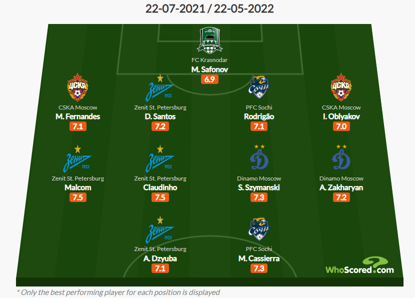 Различные статистические источники публикуют составы символических сборных лиг по итогам сезона. Отбор чаще всего простой - на основании средних оценок, выставленных игрокам за ттд. Канал публикует эти составы и предлагает свой вариант. 11 лучших по версии сайта WhoScored. В целом всё по делу. Спорными на взгляд канала выглядят трое: Дзюба. Да, он был крайне полезен "Зениту" на протяжении всего сезона, но одним из двух лучших нападающих РПЛ его нельзя назвать даже с большой натяжкой. Шиманьски. Игрок качественный и стабильный. Но, опять же, далеко не лучший игрок центра поля РПЛ. Тем более как атакующий полузащитник. По мнению канала, например, Нобоа однозначно больше заслуживает войти в топ-11 на этой позиции. Обляков. Иван сыграл в качестве левого крайнего защитника неплохо, но не так много матчей чтобы претендовать на вхождение в сборную сезона. Кроме того, в РПЛ есть игравшие не хуже профильные игроки этой позиции. Команда сезона от SofaScore. В списке снова значится Шиманьски