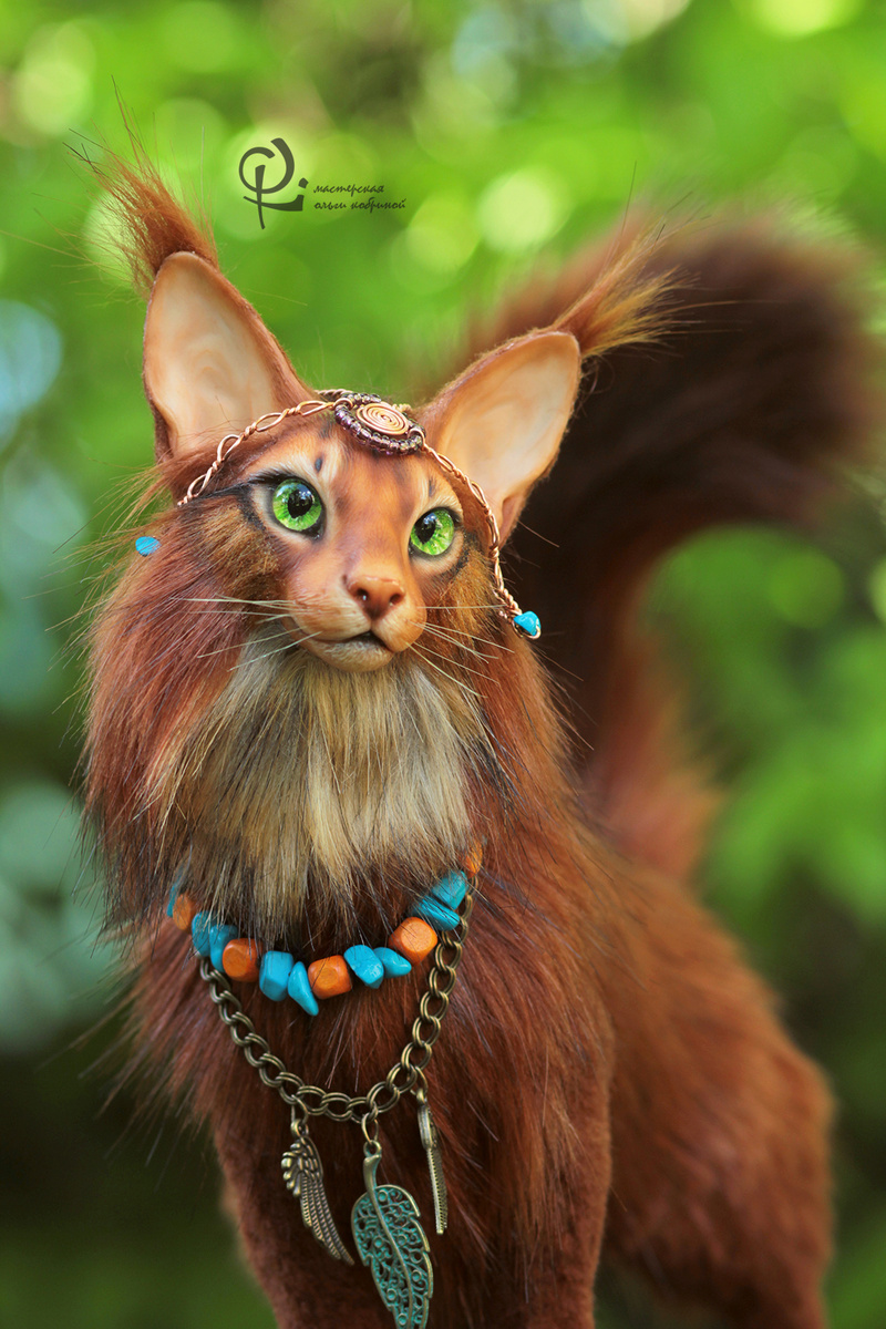 Прошлый (недавно сделанный) серый кот «взорвал» моих китайских подписчиков из другой сети. Дело в том, что большинство решило, что это был реальный кот, новая порода, которую я нелегально (некоторые даже возмущались поначалу) вывела. Меня это удивило, честно говоря. Вроде как понятно, что это кукла! Ну они уже разобрались, посмеялись, а повезло-то только одной девушке, которая его забрала)) И так как многие хотели получить подобного кота, я сотворила ещё, только кошечку на этот раз. Сразу скажу- я не люблю повторяться. Интерес ведь именно в каждом новом процессе! Какая радость делать десяток одинаковых игрушек? Конечно, их купят. Но так и десяток разных тоже купят! В общем, лично мне интересно видовое разнообразие 😊 У меня остался насыщенный медный мех и на ум сразу пришла абиссинская порода кошки. Я мысленно скрестила её с ориенталом и получила зеленоглазую восточную красавицу! 👸🏽 Кошечке я добавила украшения- колье из крылышек и патенированного листика, ожерелье из бирюз