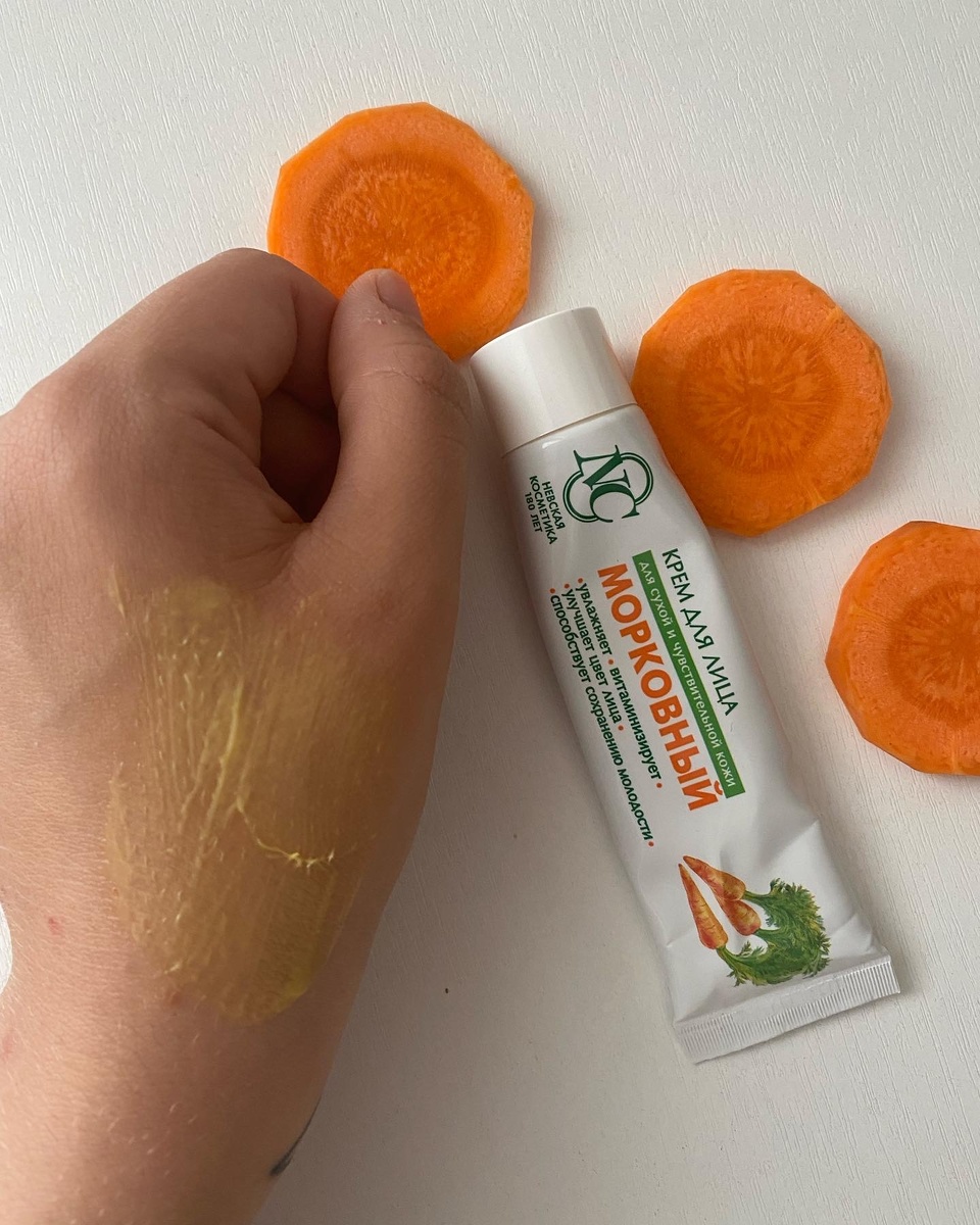 Раньше я бы не поверила в такой заголовок, но я сейчас пользуюсь как раз таким кремом) Морковный крем для лица от бренда Невская косметика очень приятно меня удивил 🥕 Этот крем очень популярен в тик-токе, только там его ичпользуют как тонирующий крем для тела. Но обо всем по порядку) Морковный крем предназначен для сухой и чувствительноц кожи. Обещают увлажнение, витаминизирование, улучшение цвета лица, устранение шелушений и сохранение молодости. Я пользуюсь им уже около двух недель и вот что могу сказать: крем классный! Да, он не сделает чудес. Но и никаких плохих последствий после него тоже нет) Он легкий, прекрасно увлажняет, быстро впитывается. Цвет лица действительно немного тонирует и улучшает, потому что моя кожа в последнее время была очень серой и тусклой. Про шелушения не могу сказать, у меня их нет, но скорее всего для очень сухой кожи его будет мало. В целом после него кожа выглядит очень неплохо, она мягкая, увлажненная и сияющая. Состав так же неплохой, основные компоне