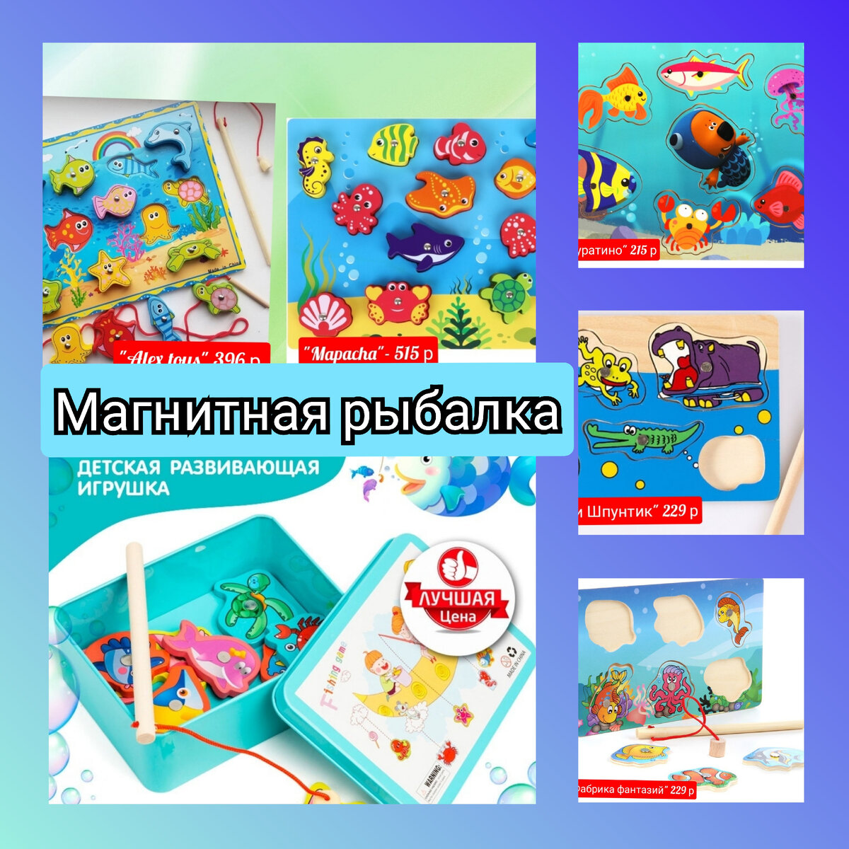 Всем здравствуйте. В прошлой статье мы с вами выбирали рамку-вкладыш с морской тематикой. Сегодня мы вновь обсудим тему моря, но уже детальнее рассмотрим игровое пособие "Магнитная рыбалка". Одна из самых востребованных игр у малышей, да и у заботливых родителей, которые также не прочь отвлечься от суеты и вернуться ненадолго в детство. Как обычно, посмотрим на пособия до 300 рублей, а также, в заключение, укажу еще 2 любопытных варианта, но стоимостью уже подороже. 1. Буратино- 215 р. Самый бюджетный вариант, с 6 видами рыб и главным героем Кешей из "Мимимишек". Изображения выполнены в виде наклеек, поэтому в воду бросать их нежелательно, после непродолжительного времени они отклеятся, ребенок будет огорчен. В целом, игра неплохая, но все же, дети непременно пожелают взять фигурки и удочку с собой в ванную или хотя бы попробуют поймать рыбок из тазика, ведра с водой. 2. "Фабрика фантазий" и "Винтик и Шпунтик" оба пособия стоят 229 р. В первом варианте минусы: небольшое количество вк