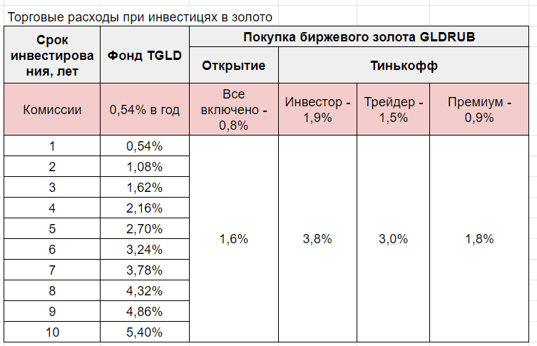 Комиссия за сделки по фонду TGLD - нулевые (для клиентов банка). При покупке биржевого золото GLDRUB - 1,9% в Тинькофф, в Открытие - 0,8%.
