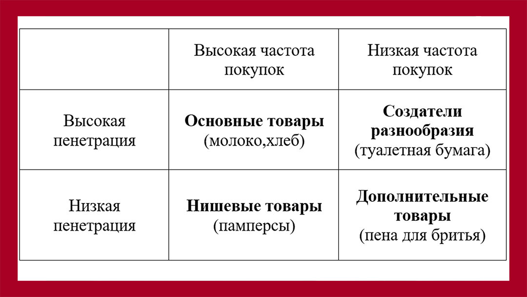 ❓Вопрос подписчика ❓ Под твой вопрос создали научное направление. Называется категорийный менеджмент. В 1990 Фейдер и Лодиш исследовали влияние разных товаров на всяческие промо-активности: Для начала разделили товары на 4 группы. Группы отличаются по 2 показателям: Отсюда 4 группы: Пример, молоко. Его покупают 85% людей, практически каждая семья. Это и есть высокая пенетрация. Покупается очень часто, более 20 чеков в год. А что памперсы? Далеко не у всех есть дети, процент чеков с памперсами мал, но покупаются часто. Отсюда низкая пенетрация, но высокая частота покупок, как у молока. Так вот реклама ведёт к значительному росту продаж только «Основных» и «Нишевых» товаров, у которых высокая частота покупок. Поэтому, тратить бюджеты на рекламу через кампании или креативы с невостребованным, залежалым или товаром с высоким циклом нет смысла. Если представить салон красоты, как магазин, то рекламироваться через мужскую лазерную эпиляцию плохая идея, при наличии услуг женского маникюра. И