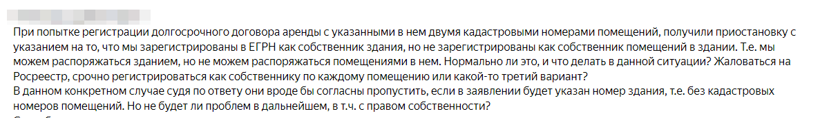 Всем привет! Громкий заголовок? Уверяю, никакого «кликбейта». Важно понимать, что «распоряжаться» - это значит, в том числе, совершать регистрационные сделки. Как обычно, делюсь конкретным случаем из практики. Вопрос от Заказчика Бывает такая категория Заказчиков, которые создают много проблем из пустого места. Самое плохое, когда эти проблемы создаются из-за неведения и попыток самостоятельно решить вопрос. Так и в нашем случае – наш давний Заказчик обратился с вопросом, который приведен на скриншоте ниже. Суть вопроса Учимся на чужих ошибках Договор аренды – это документ, подтверждающий наложение обременения в виде аренды на объект (или на часть объекта). Официально арендовать можно только то, на что официально зарегистрировано право. Официальное право зарегистрировано на здание? Значит арендовать можно только здание или его часть. ❗️При этом мы не должны путать понятия «часть здания» и «помещение», хотя они схожи по смыслу в широком употреблении, но имеют абсолютно разные правовые