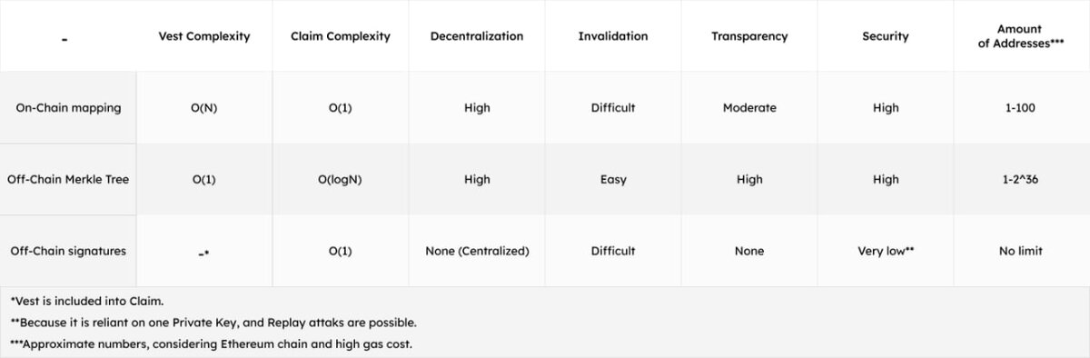 3 cпособа реализации смарт-контракта для вестинга ℹ️Контракт вестинга — это контракт, который позволяет владельцам проектов выделять токены для своих пользователей, но заставляет самих пользователей брать токены из контракта вестинга. Такая операция называется «claim». Чтобы заклеймить токены, пользователи должны доказать смарт-контракту, что они имеют на это право. Для этого владелец проекта должен создать какое-то условие для проверки, что конкретный пользователь действительно может претендовать на токены. Есть три способа сделать это: 1️⃣Ончейн-решение — заполнить связку (адрес => uint256), которая вернет сумму uint256, на которую может клеймить пользователь с определенным адресом. Плюсы: 🔸Простота. Это очень легко реализовать. 🔸Все хранится в сети, поэтому прозрачность и безопасность немного выше. Минусы: 🔸VestTokensMany не оптимизирован для большого количества данных (например, 1000 адресов). Инициализация большого количества адресов может стоить до $10000 в цепочке Ethereum.